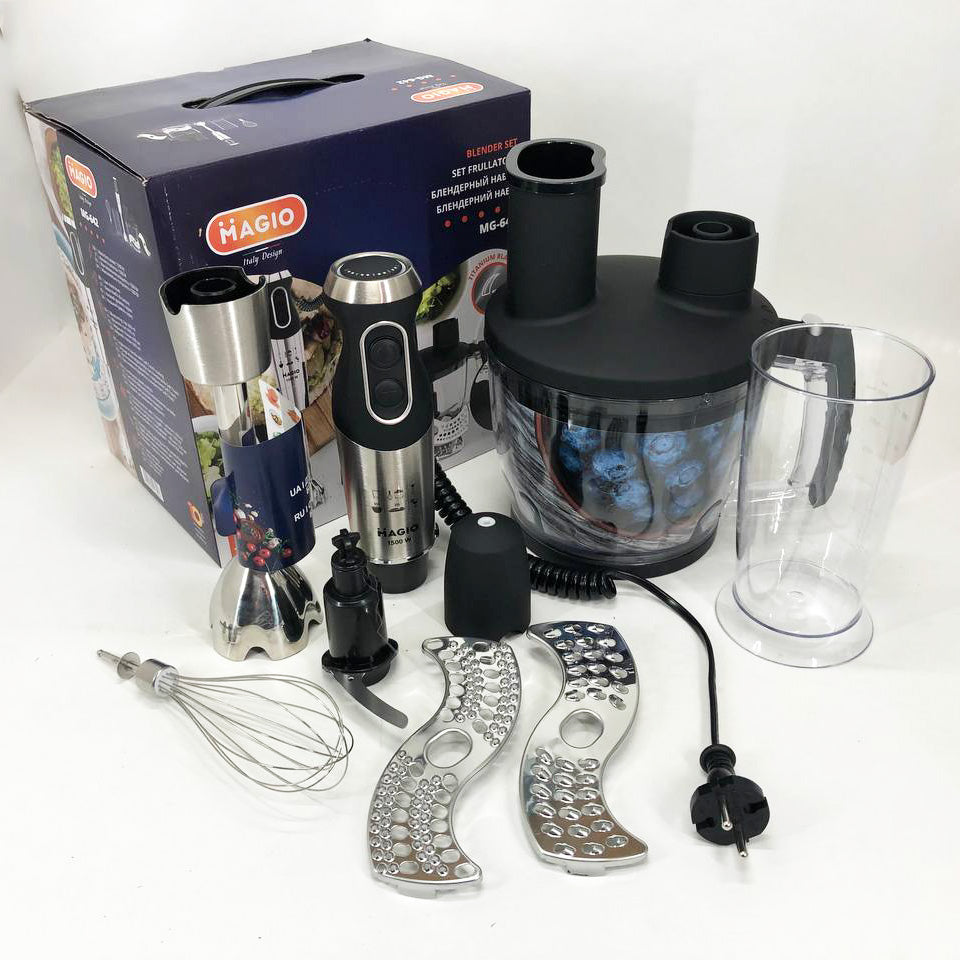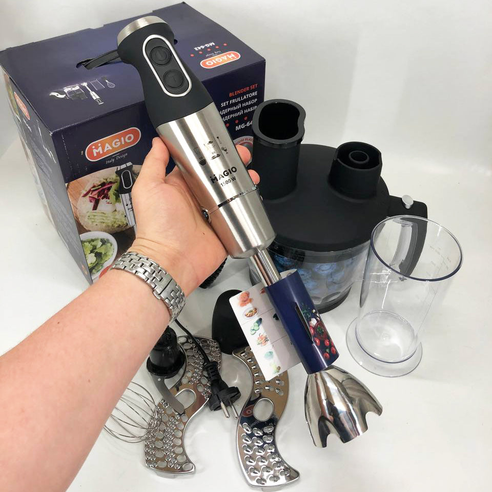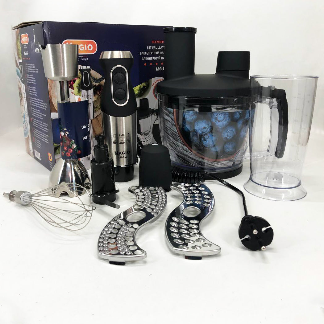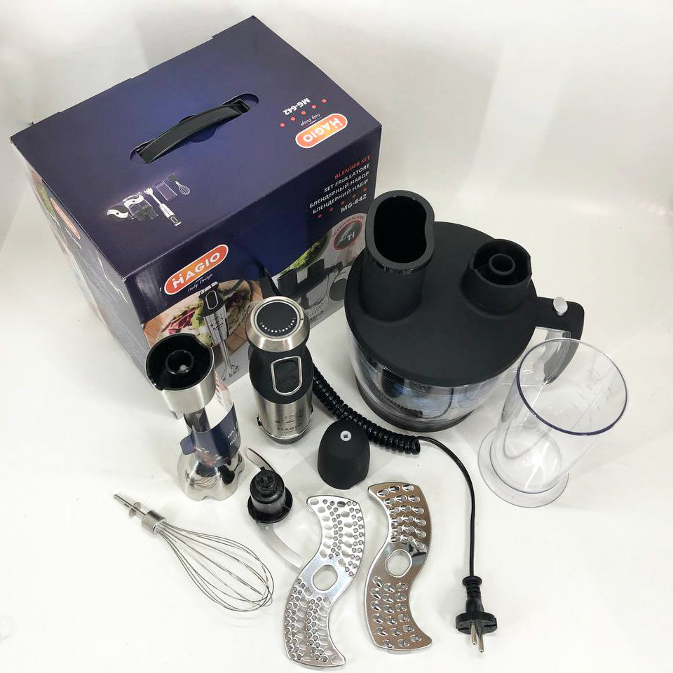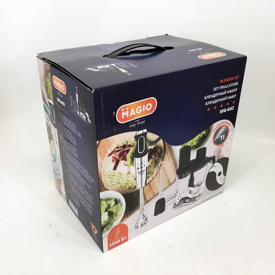 Блендерный набор MG-642 позволит вам разнообразить ваше меню и приготовить новый кулинарный шедевр. Мощность блендера составляет 1500 Вт, что обеспечивает бесшумную эффективную работу в течение длительного времени. Погружная часть выполнена из нержавеющей стали, а нож с ТИТАНОВЫМ покрытием — залог устойчивости к износу и долговечности,еще одним достоинством блендера являеться спиральный провод который не будет мешать во время приготовления. Эргономическая рукоятка с приятным покрытием SOFT TOUCH. Блендер может работать на 13 плавно переключающихся скоростях. Переключатель находится на рукоятке прибора, что весьма удобно. В комплект входит пластиковый мерный стакан, венчик для взбивания и мини-комбайн с покрытием SOFT TOUCH с 3 насадками  - объем 1250 мл.  Насадки: нарезка, шинковка и терка. Эти свойства в сочетании с компактным дизайном делают блендер незаменимым помощником на вашей кухне.