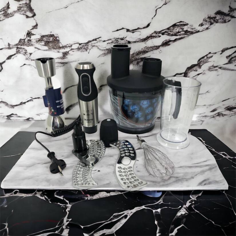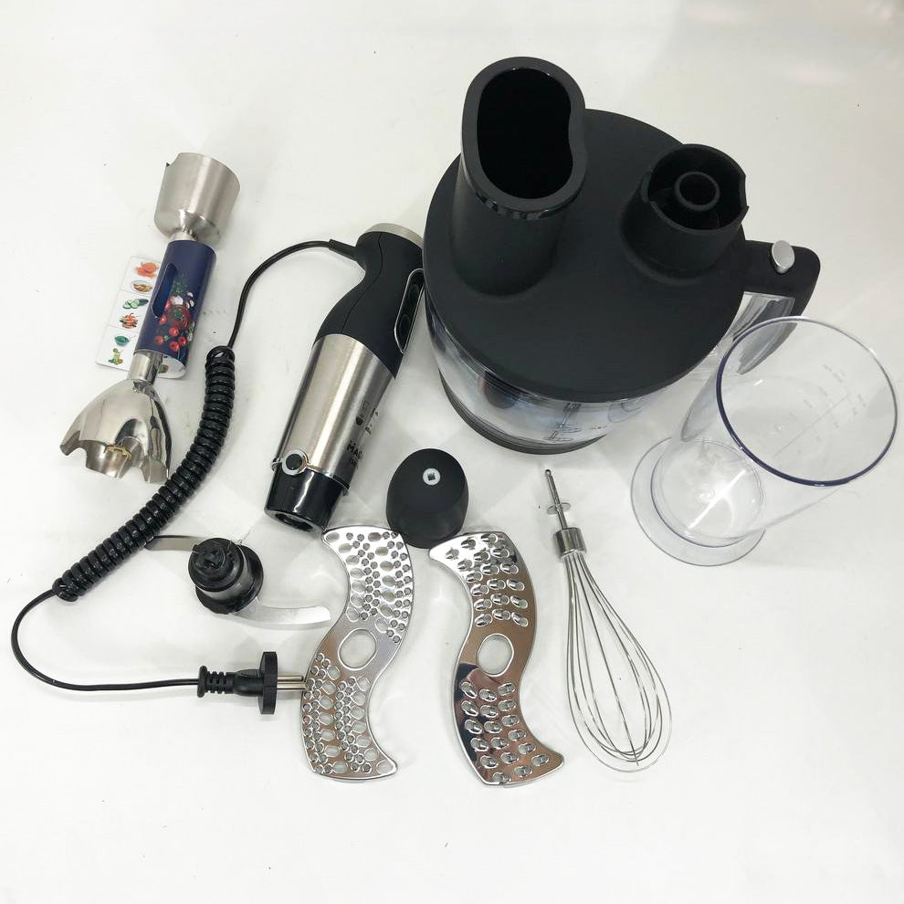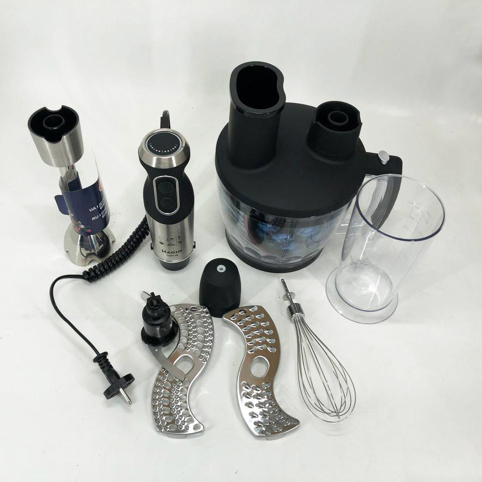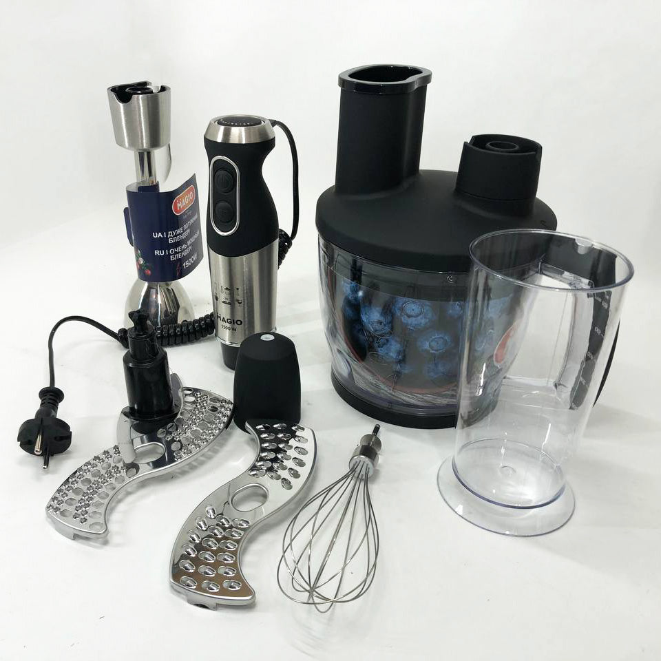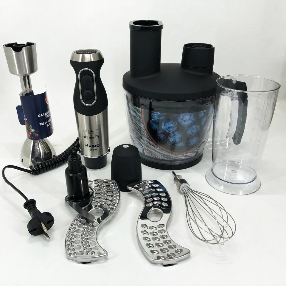 Блендерный набор MG-642 позволит вам разнообразить ваше меню и приготовить новый кулинарный шедевр. Мощность блендера составляет 1500 Вт, что обеспечивает бесшумную эффективную работу в течение длительного времени. Погружная часть выполнена из нержавеющей стали, а нож с ТИТАНОВЫМ покрытием — залог устойчивости к износу и долговечности,еще одним достоинством блендера являеться спиральный провод который не будет мешать во время приготовления. Эргономическая рукоятка с приятным покрытием SOFT TOUCH. Блендер может работать на 13 плавно переключающихся скоростях. Переключатель находится на рукоятке прибора, что весьма удобно. В комплект входит пластиковый мерный стакан, венчик для взбивания и мини-комбайн с покрытием SOFT TOUCH с 3 насадками  - объем 1250 мл.  Насадки: нарезка, шинковка и терка. Эти свойства в сочетании с компактным дизайном делают блендер незаменимым помощником на вашей кухне.