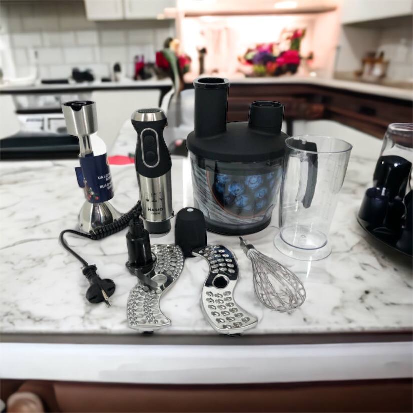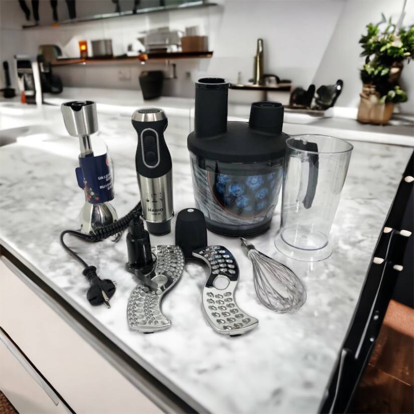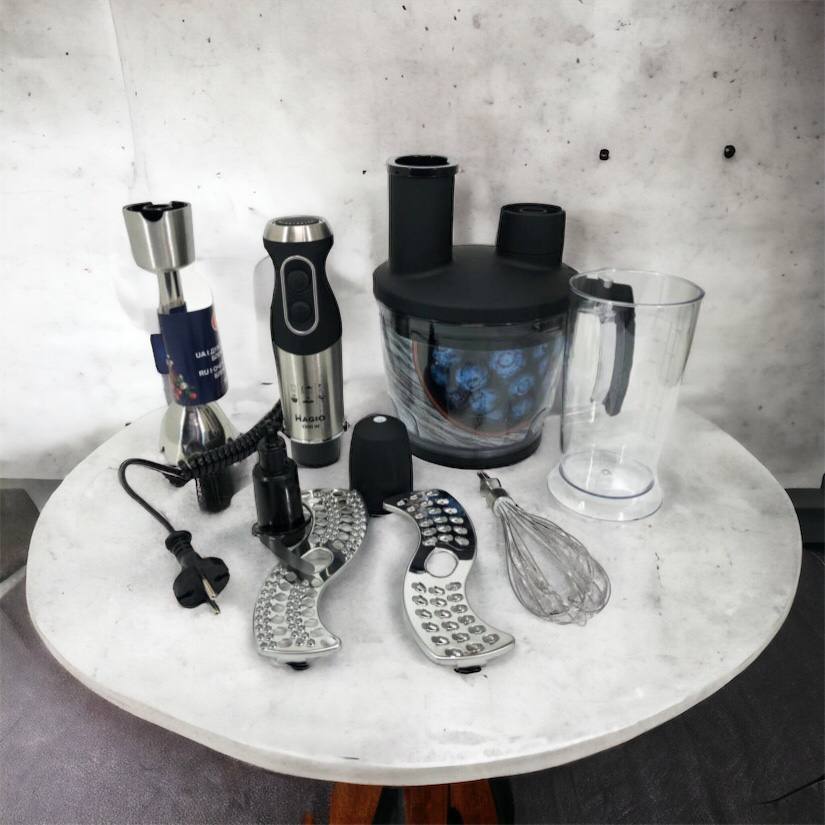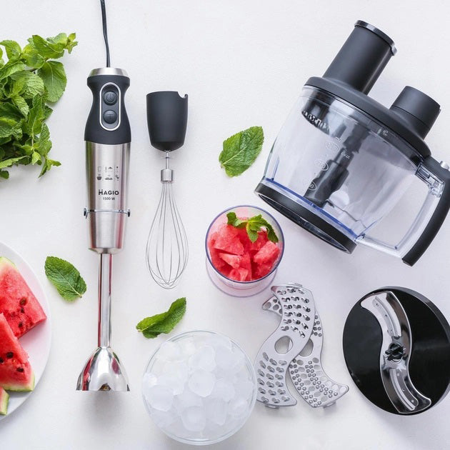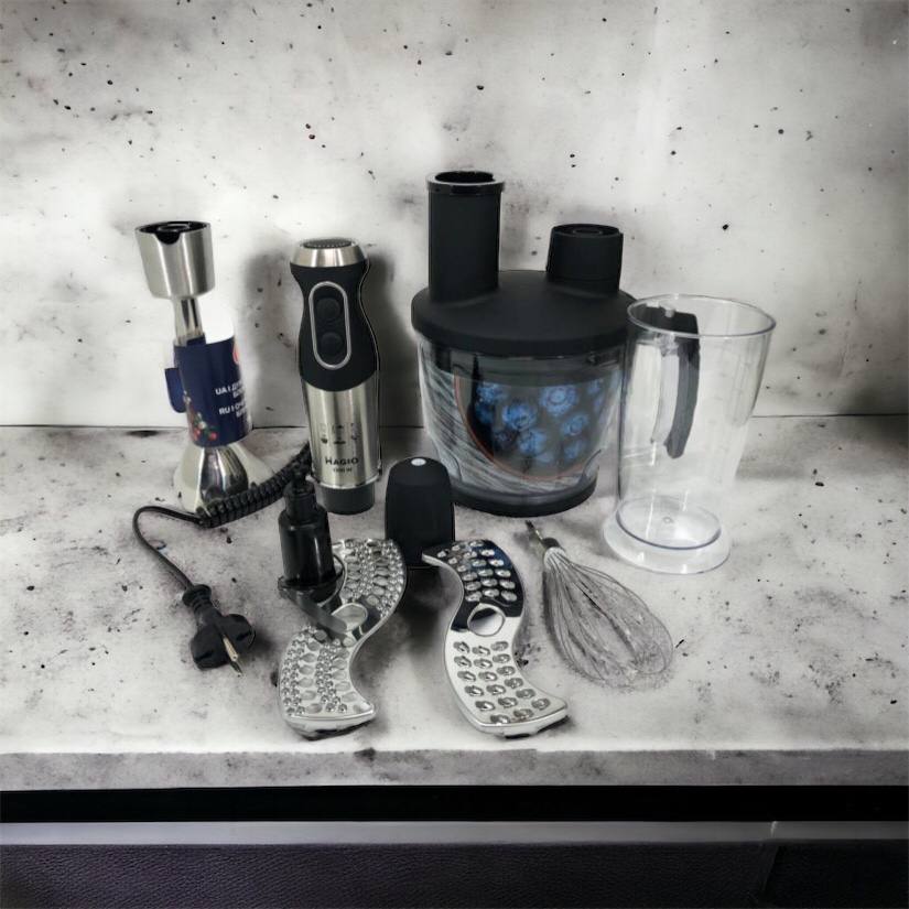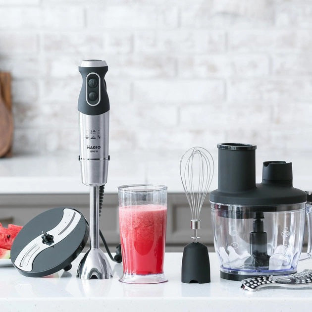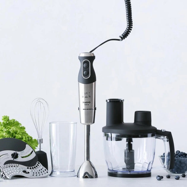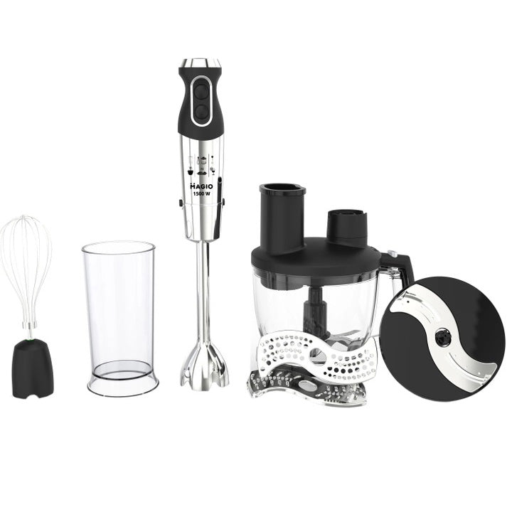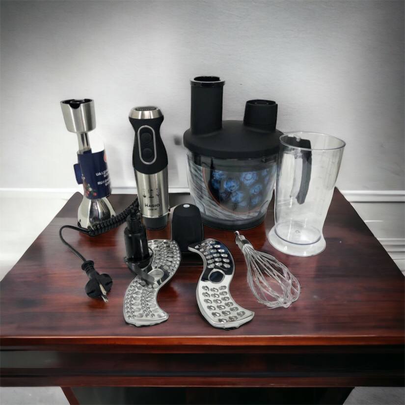 Блендерный набор MG-642 позволит вам разнообразить ваше меню и приготовить новый кулинарный шедевр. Мощность блендера составляет 1500 Вт, что обеспечивает бесшумную эффективную работу в течение длительного времени. Погружная часть выполнена из нержавеющей стали, а нож с ТИТАНОВЫМ покрытием — залог устойчивости к износу и долговечности,еще одним достоинством блендера являеться спиральный провод который не будет мешать во время приготовления. Эргономическая рукоятка с приятным покрытием SOFT TOUCH. Блендер может работать на 13 плавно переключающихся скоростях. Переключатель находится на рукоятке прибора, что весьма удобно. В комплект входит пластиковый мерный стакан, венчик для взбивания и мини-комбайн с покрытием SOFT TOUCH с 3 насадками  - объем 1250 мл.  Насадки: нарезка, шинковка и терка. Эти свойства в сочетании с компактным дизайном делают блендер незаменимым помощником на вашей кухне.