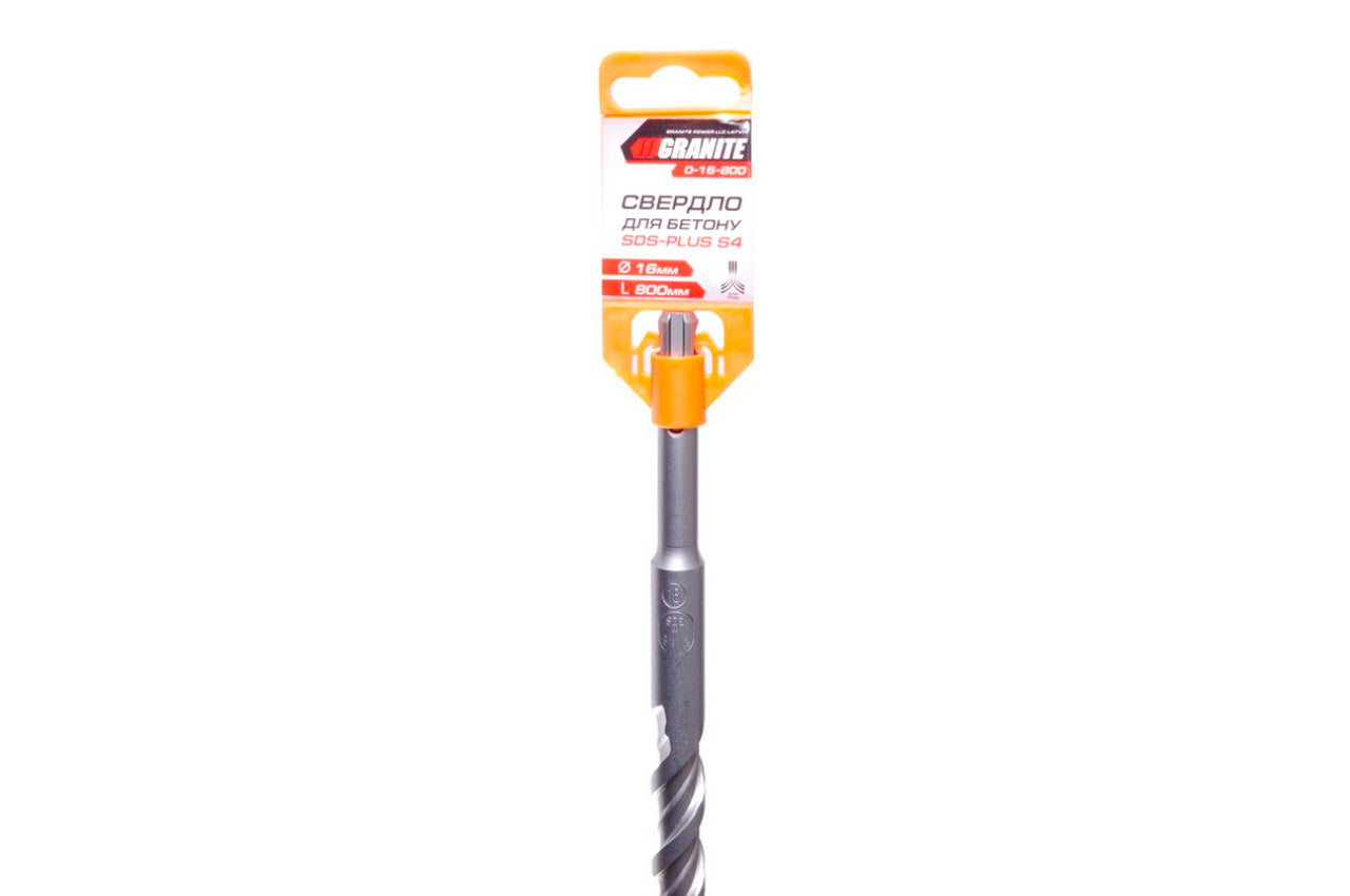 Бур по бетону "Granite" с твердосплавной победитовой напайкой. Используется для образования сквозного или глухого отверстия в сплошном материале и/или для увеличения диаметра имеющегося отверстия. Применяется для отделки кирпичной кладки, железобетона, гранита и жесткого бетона. Хвостовик SDS+; Диаметр сверления – 16 мм; Длина бурая – 800 мм.