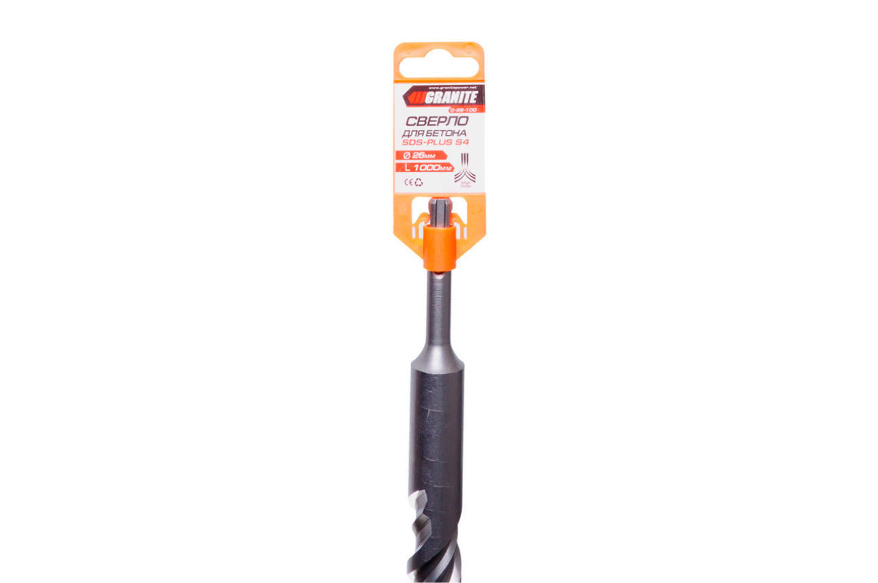 Бур по бетону "Granite" с твердосплавной победитовой напайкой. Используется для образования сквозного или глухого отверстия в сплошном материале и/или для увеличения диаметра имеющегося отверстия. Применяется для отделки кирпичной кладки, железобетона, гранита и жесткого бетона. Хвостовик SDS+; Диаметр сверления – 26 мм; Длина бурая – 1000 мм.