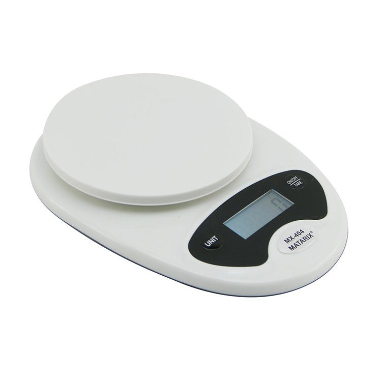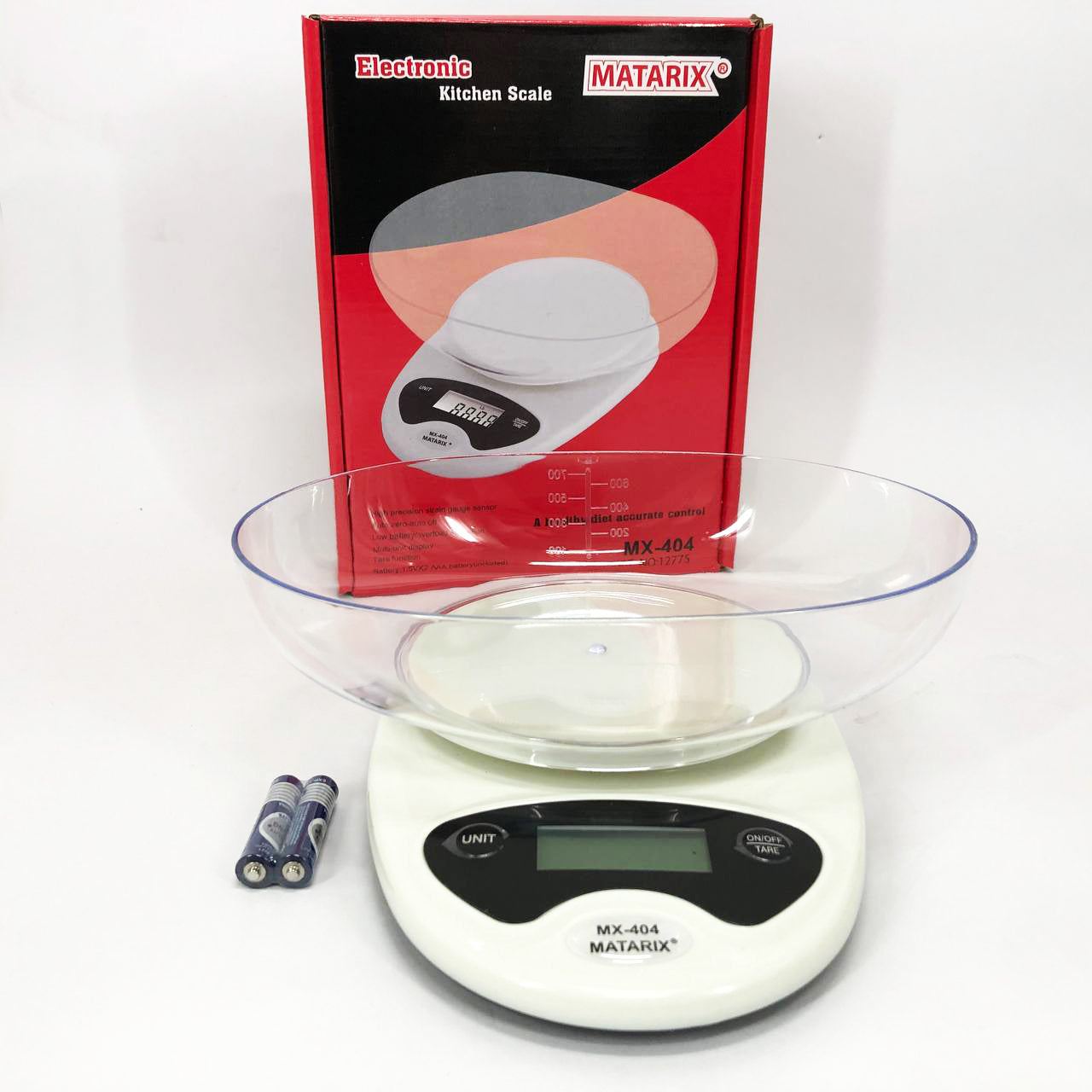 Весы кухонные Matarix MX-404 выполнены в пластиковом корпусе. Имеют круглую платформу и чашу из прозрачного пластика. Можно также использовать любую другую тару. Жидкокристаллический дисплей с белой подсветкой и резиновые ножки. Выполнены в пластиковом корпусе. Имеют круглую платформу, на которую можно устанавливать чашу из пластика. Есть функции тарирования, переключения единиц измерения и обнуление тары, а также имеют функцию автоматического отключения. Устройство питают две батарейки типа AAA (не идут в комплекте).