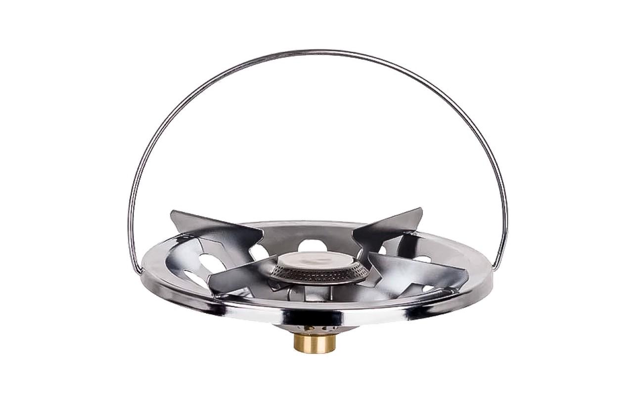 Кастрюли и котелки не наклоняются и надежно размещаются на крепкой металлической подставке. Расход газа: 145 г/час; Совместимость: резьбовой стандарт W21,8 - 14LH; Диаметр тарелки: 220 мм