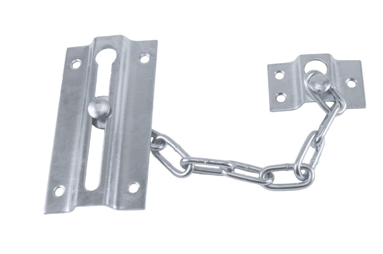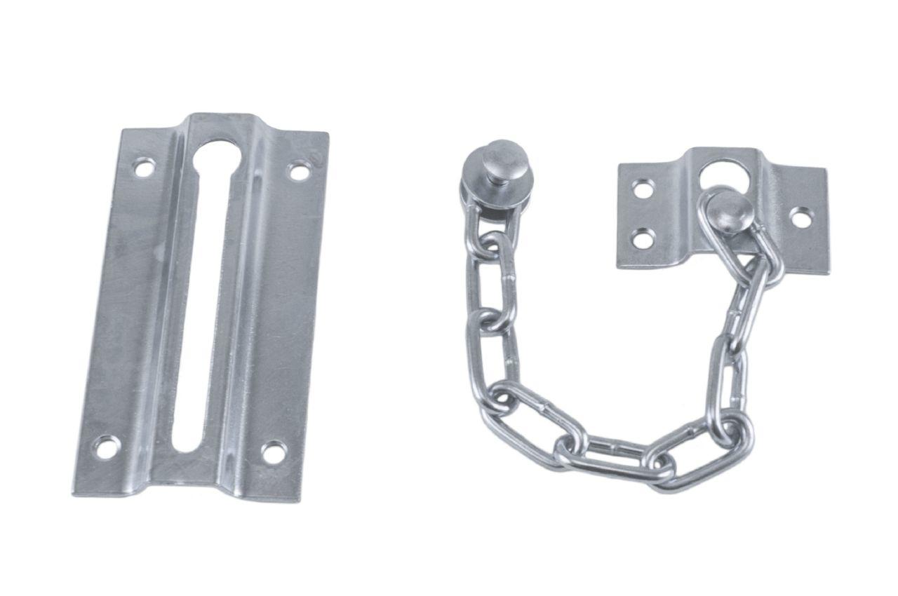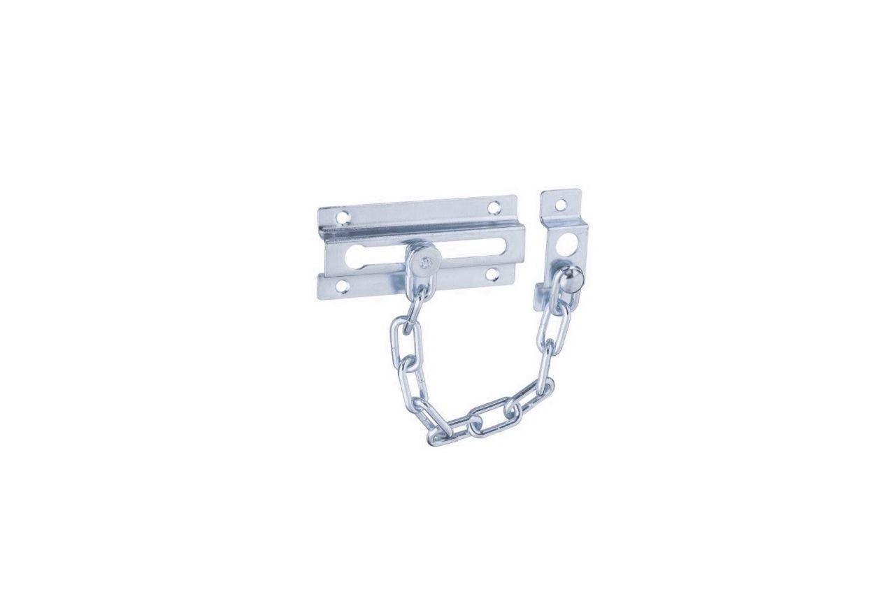 Дверная цепочка предназначена для безопасного открытия наружной двери на небольшое расстояние. Это металлическая короткая цепочка, один конец которой стационарно закреплён на дверной коробке, а другой конец, оснащённый крючком, заходит в отверстие щеколды.