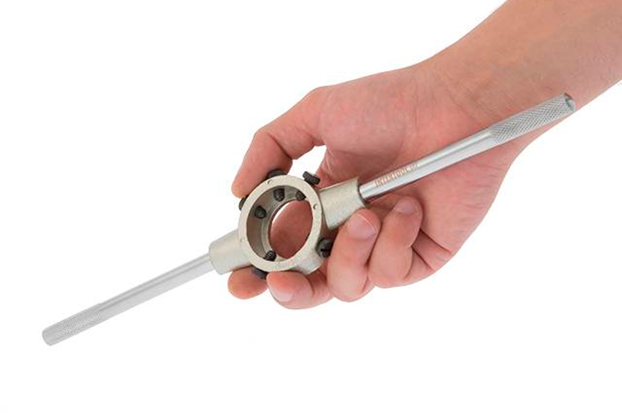 Держатель предназначен для фиксации плашек размерами М12 с последующей нарезкой наружной резьбы. Держатель достаточно простой конструкции с хромированным покрытием. Размер под плашку регулируется с помощью винтов, они также плотно фиксируют плашку против скольжения, что обеспечивает точно нарезанную резьбу без перекосов. Ручки держателя с насечками для удобной работы против скольжения.