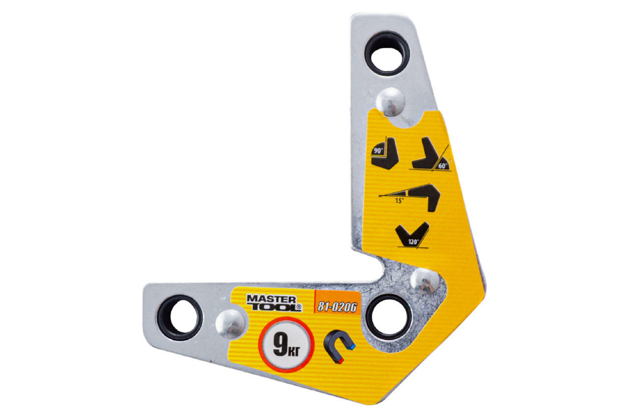 Держатель магнитный для сварки Mastertool - 9 кг угловой неодимовый магнит, предназначен для фиксации деталей при сварочных работах под углами 15°, 60°, 90°, 120°.