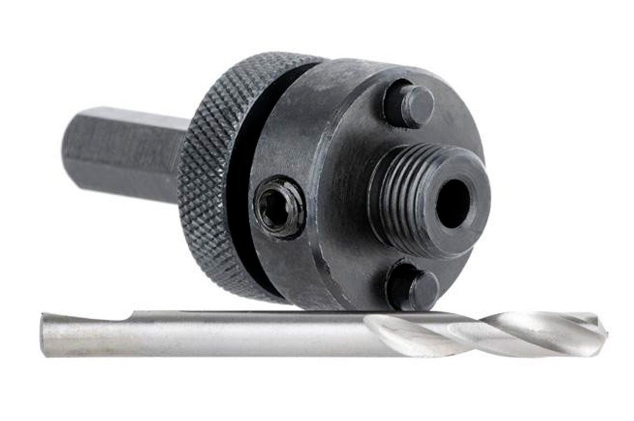 Переходник с направляющим сверлом, предназначен для установки коронок с диаметром от 32 до 102 мм, с посадочной резьбой 7/16”. Коронка накручивается на резьбовое соединение, а держатель надежно фиксируется в патроне инструмента шестигранным хвостовиком. Посадочная резьба и хвостовик не слизываются т.к. держатель изготовлен из прочной инструментальной стали. Благодаря шестигранному хвостовику держатель не проскальзывает в патроне. Диаметр направляющего сверла: 6,5 мм; Тип хвостовика: шестигранный; Диаметр хвостовика: 12.5 мм; Резьба: 7/16”; Совместимость: для коронок от 32 до 210 мм