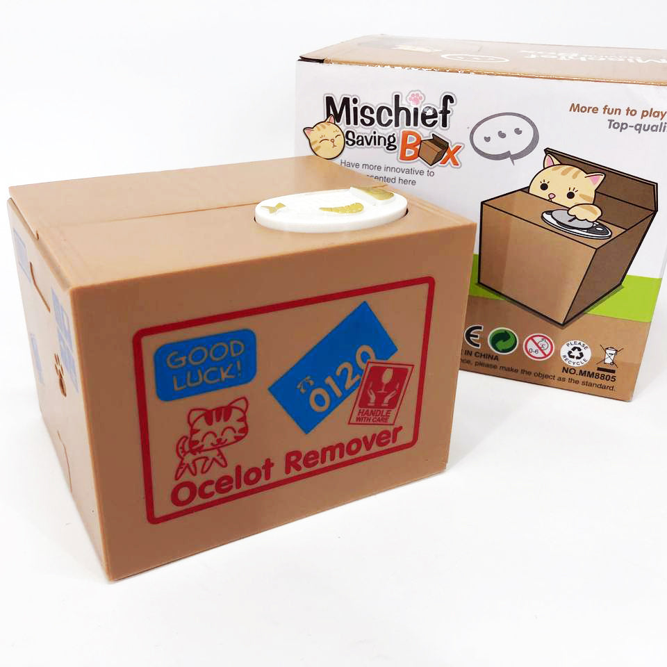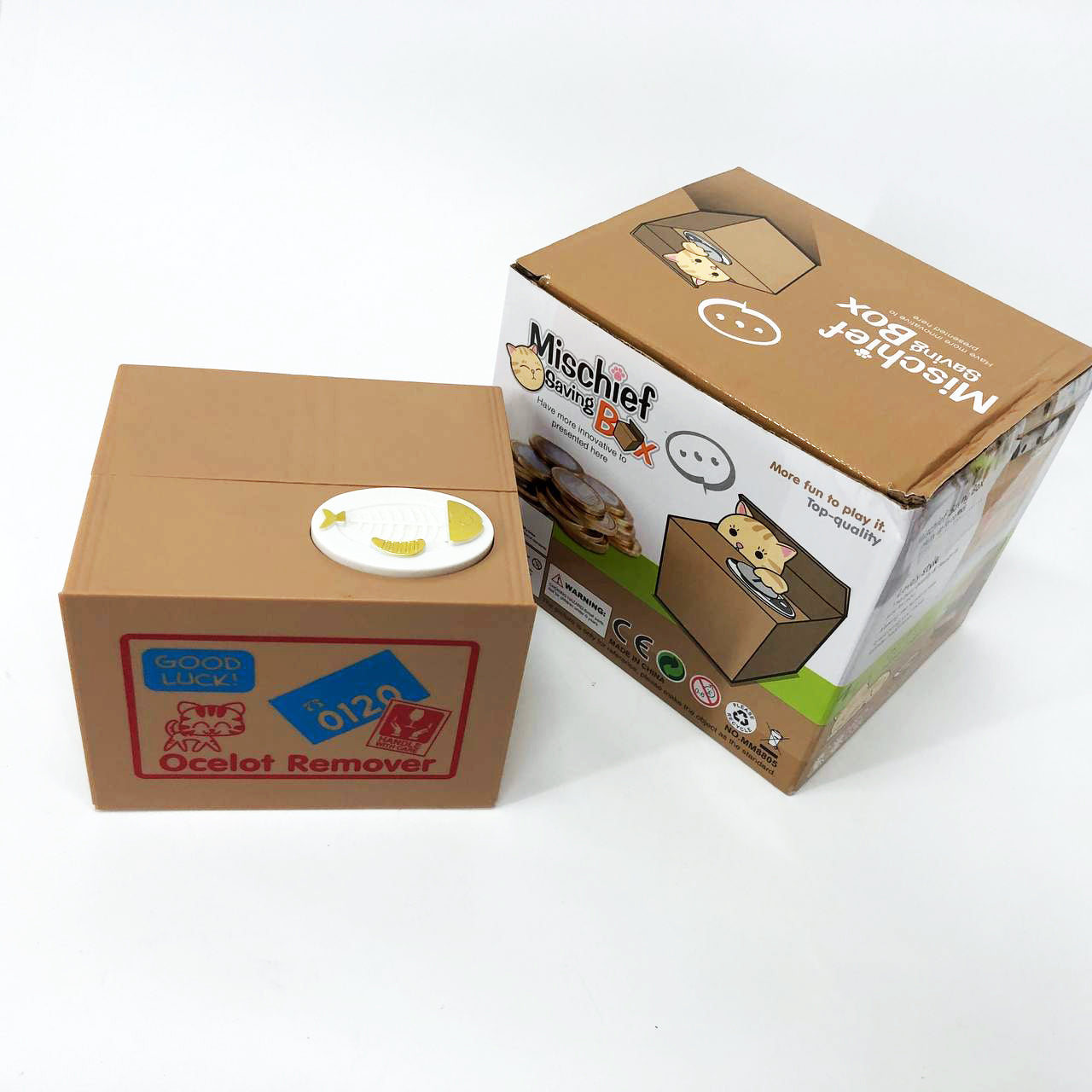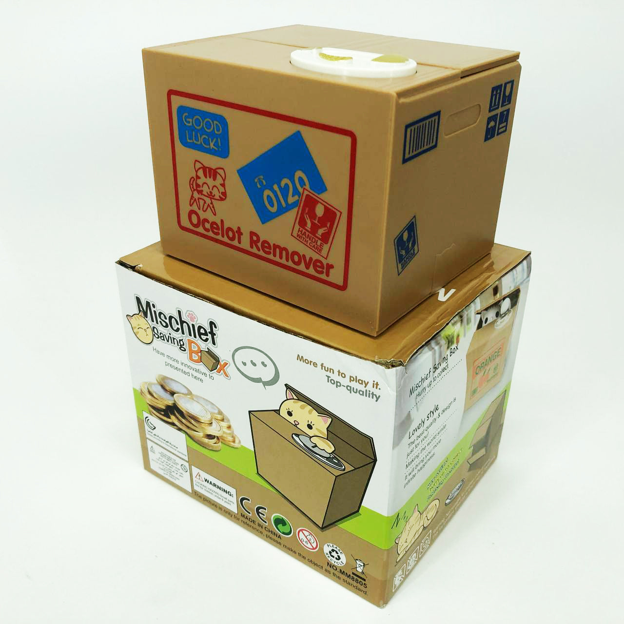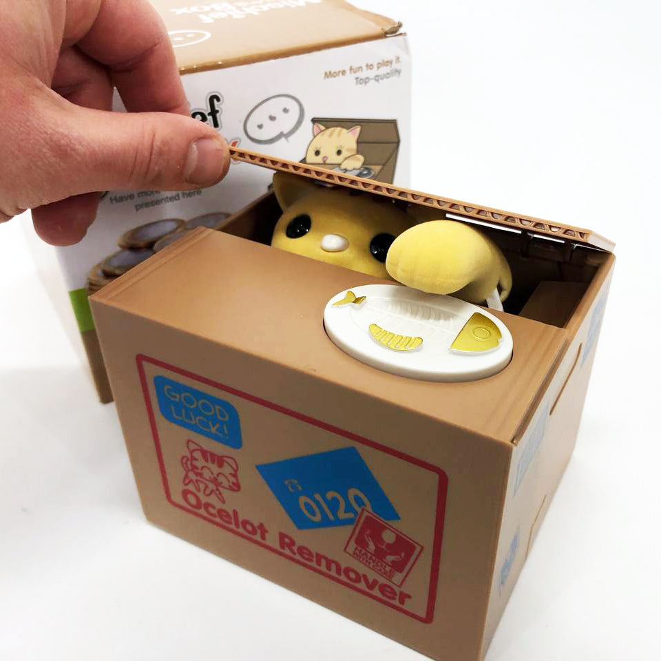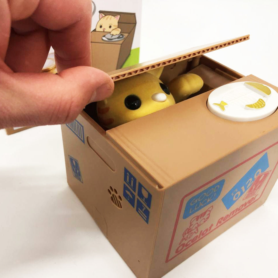 Копилка выполнена в виде котика сидящего в картонной коробке. Сверху лежит мисочка, как только Вы кладете на тарелку монетку, из коробки раздаётся звук животного и появляется хитрая мордочка, и лапка, которая забирает монетку. Внизу есть отверстие которое закрывается крышкой, благодаря которому монетки можно доставать.