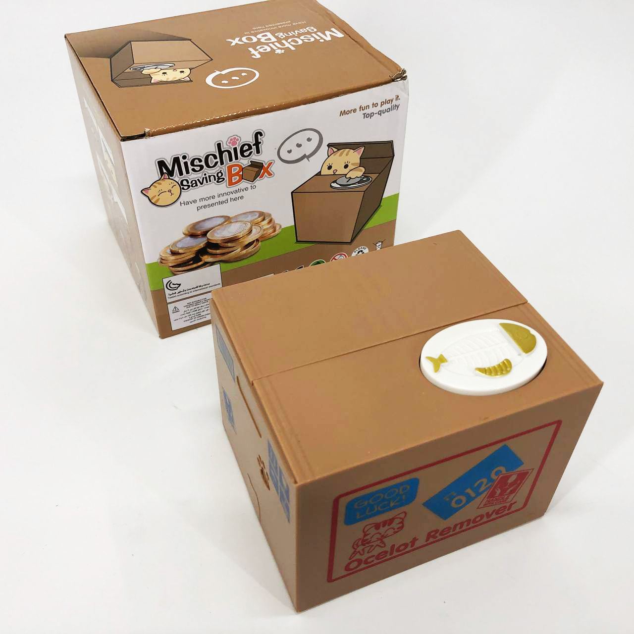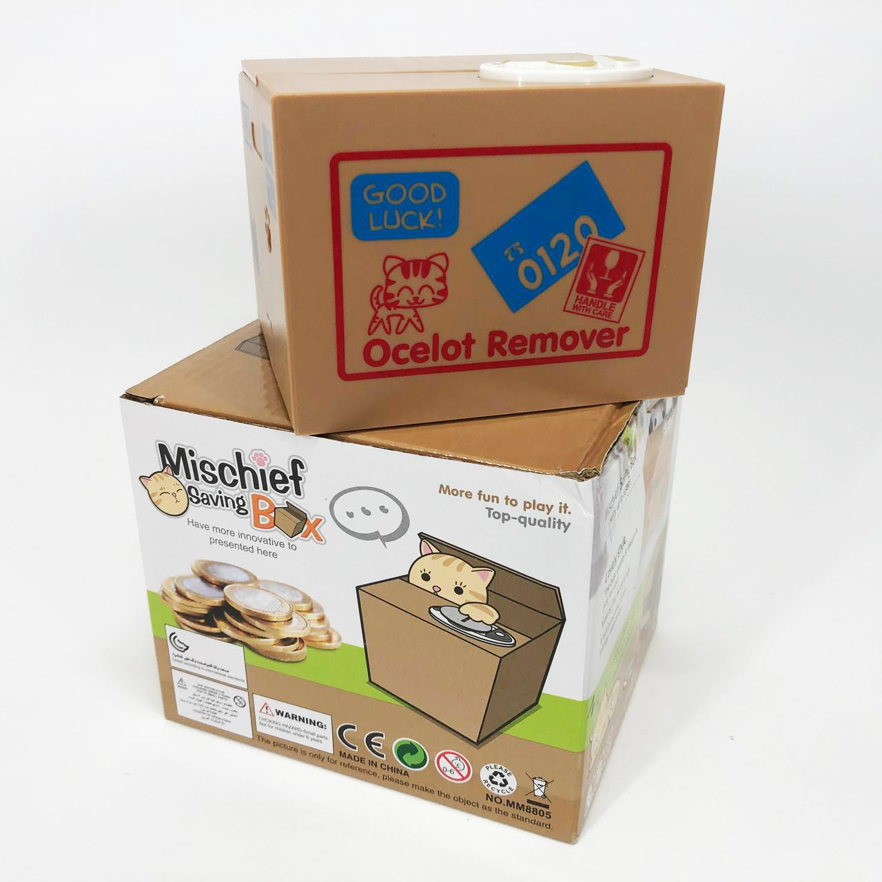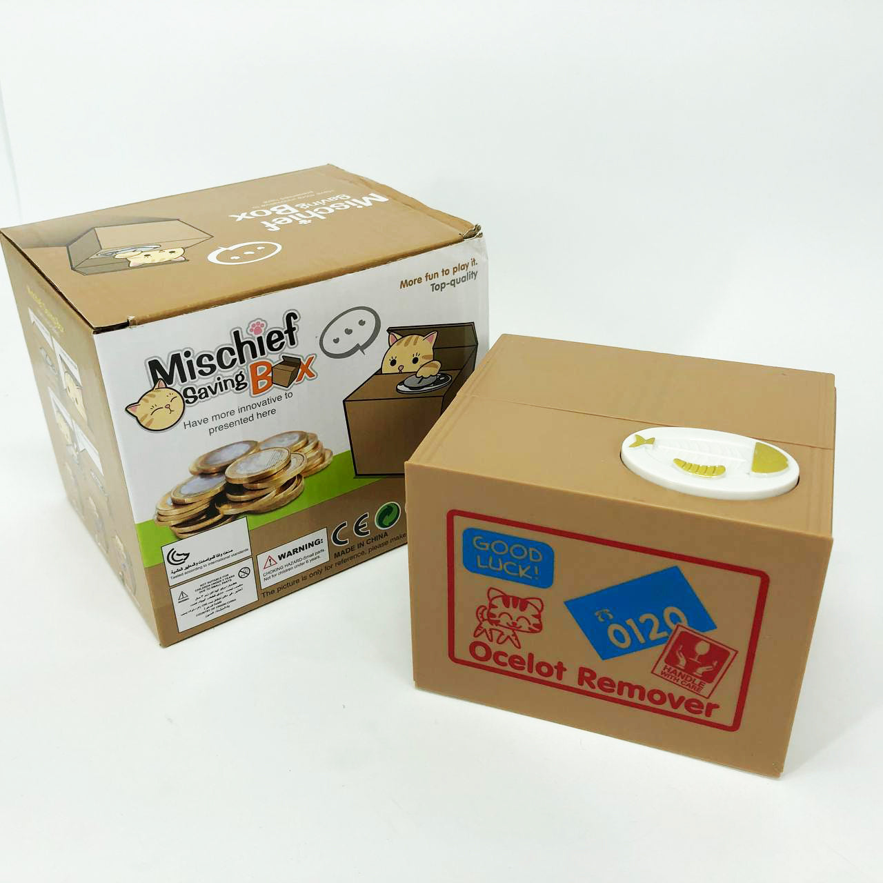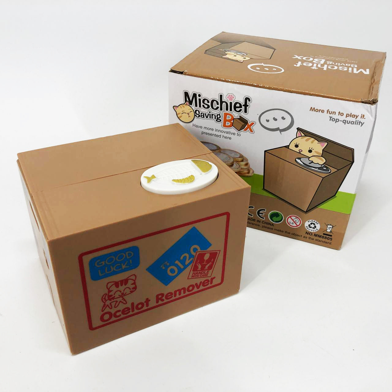 Копилка выполнена в виде котика сидящего в картонной коробке. Сверху лежит мисочка, как только Вы кладете на тарелку монетку, из коробки раздаётся звук животного и появляется хитрая мордочка, и лапка, которая забирает монетку. Внизу есть отверстие которое закрывается крышкой, благодаря которому монетки можно доставать.