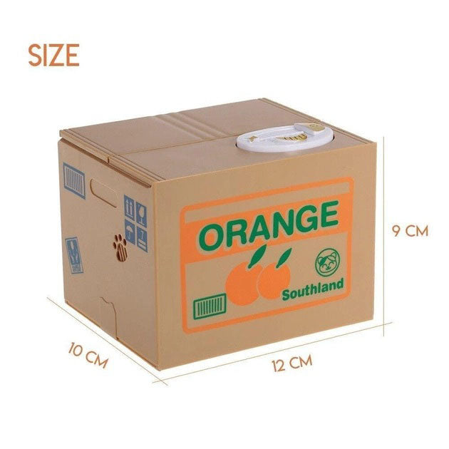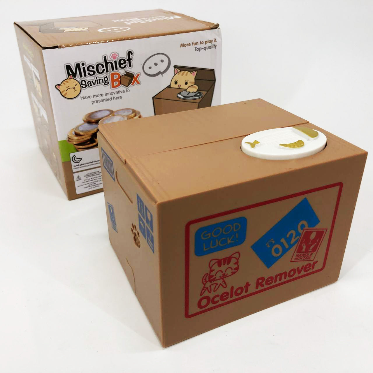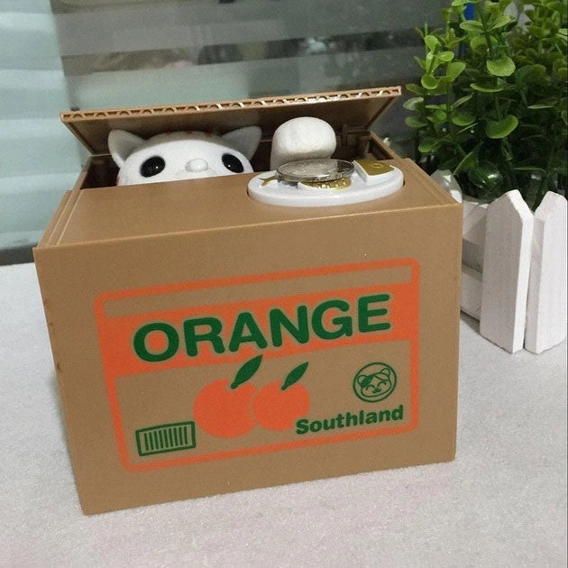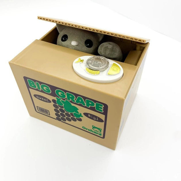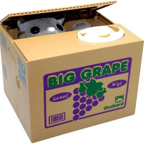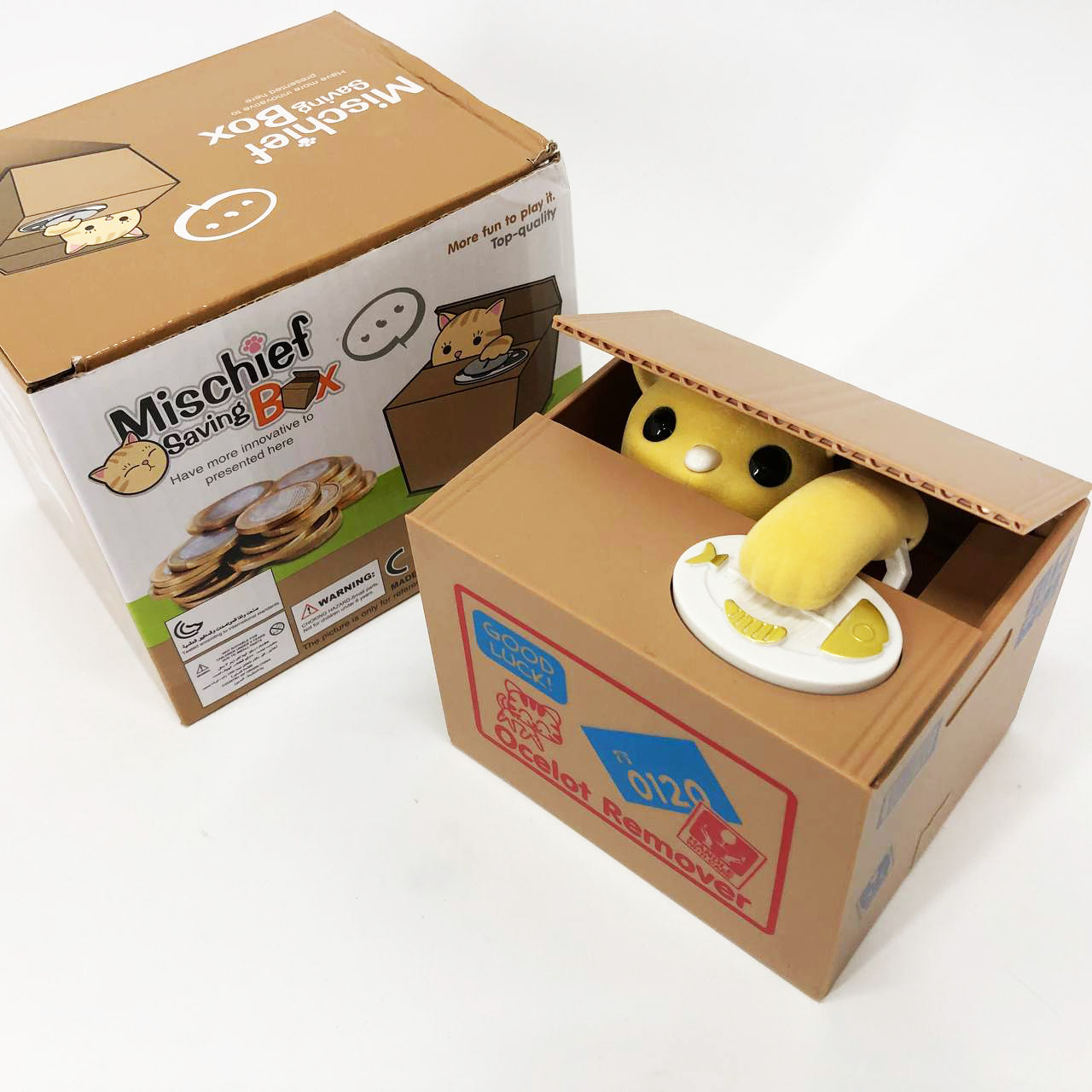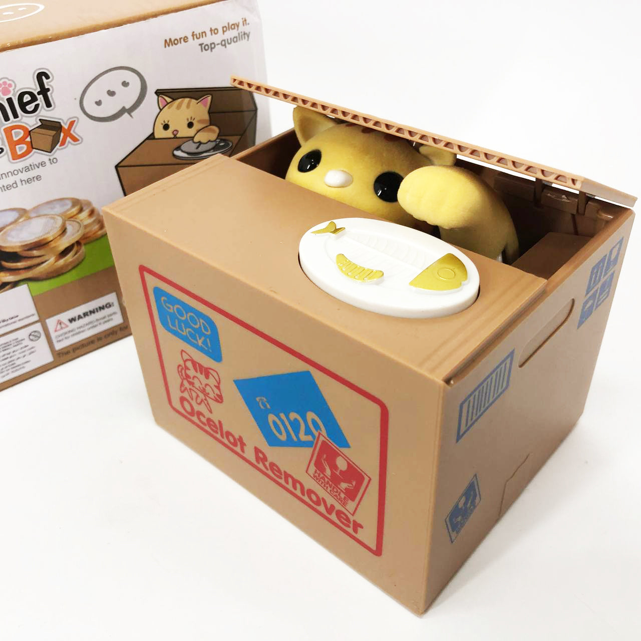 Копилка выполнена в виде котика сидящего в картонной коробке. Сверху лежит мисочка, как только Вы кладете на тарелку монетку, из коробки раздаётся звук животного и появляется хитрая мордочка, и лапка, которая забирает монетку. Внизу есть отверстие которое закрывается крышкой, благодаря которому монетки можно доставать.