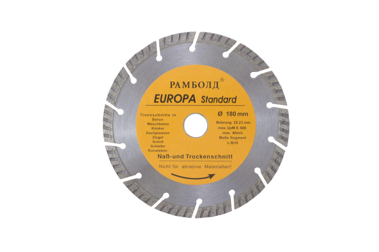 Алмазный диск "Рамболд" предназначен для сухой резки строительных материалов, таких как бетон, кирпич, камень, гранит, огнеупорный материал. Используется на УШМ, ручном электрическом плиткорезе, штроборезе. Состоит из алмазных сегментов и стального корпуса. Имеет уникальную функцию самозатачивания. Диаметр диска 180 мм. Размер отверстия 22,2 мм.
