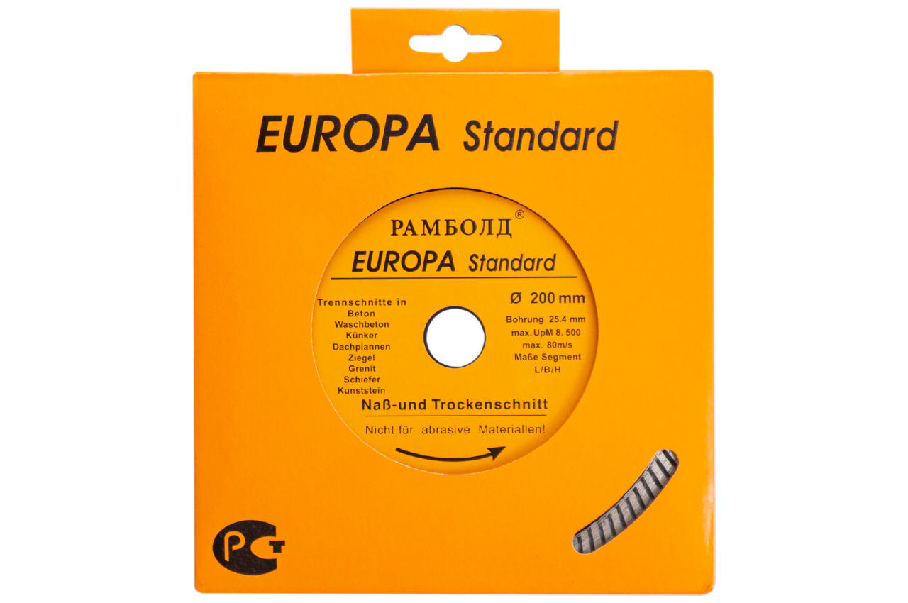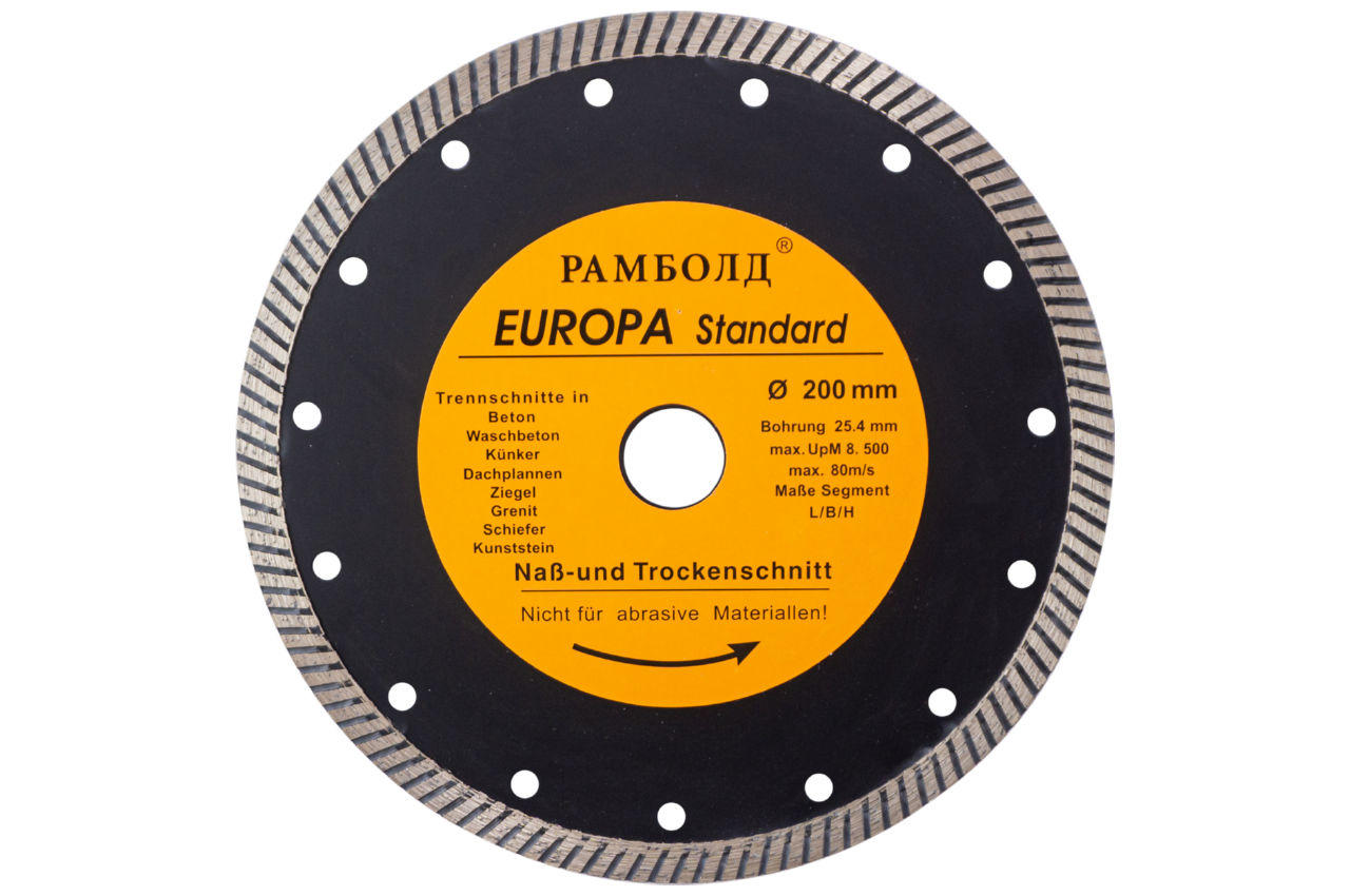 Диск алмазный Рамболд предназначен для разрезки бетона, армированного бетона, кирпича, тротуарной плитки и песчаника. Диаметр круга 200 мм.