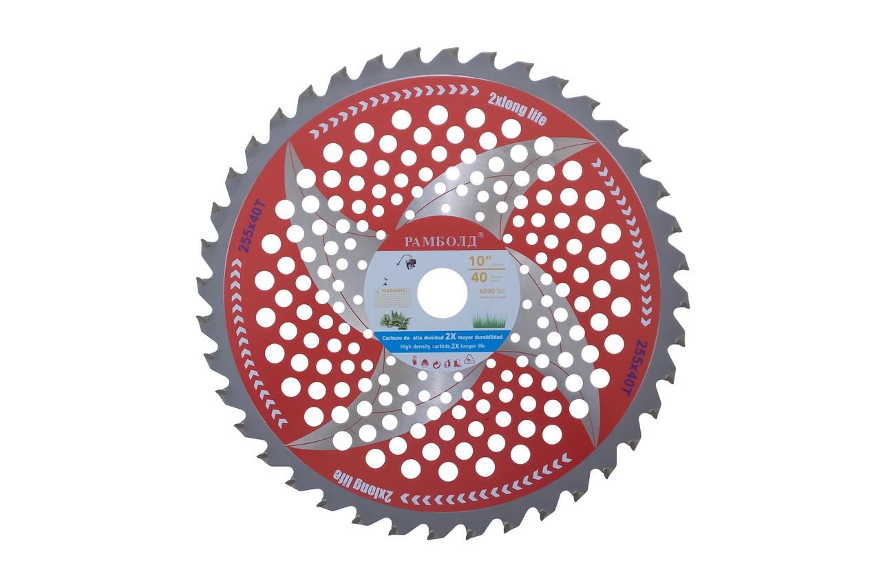 Диск для триммера Рамболд представляет собой 40-зубчатый нож с твердосплавными напайками имеющий диаметр 255 мм - предназначен для кошения травы, камыша, бурьяна с толстым диаметром ствола, поросли возле деревьев, кустарников и т. д. как на небольших территориях (дачи, усадьбы, часные дома) так и на больших площадях.