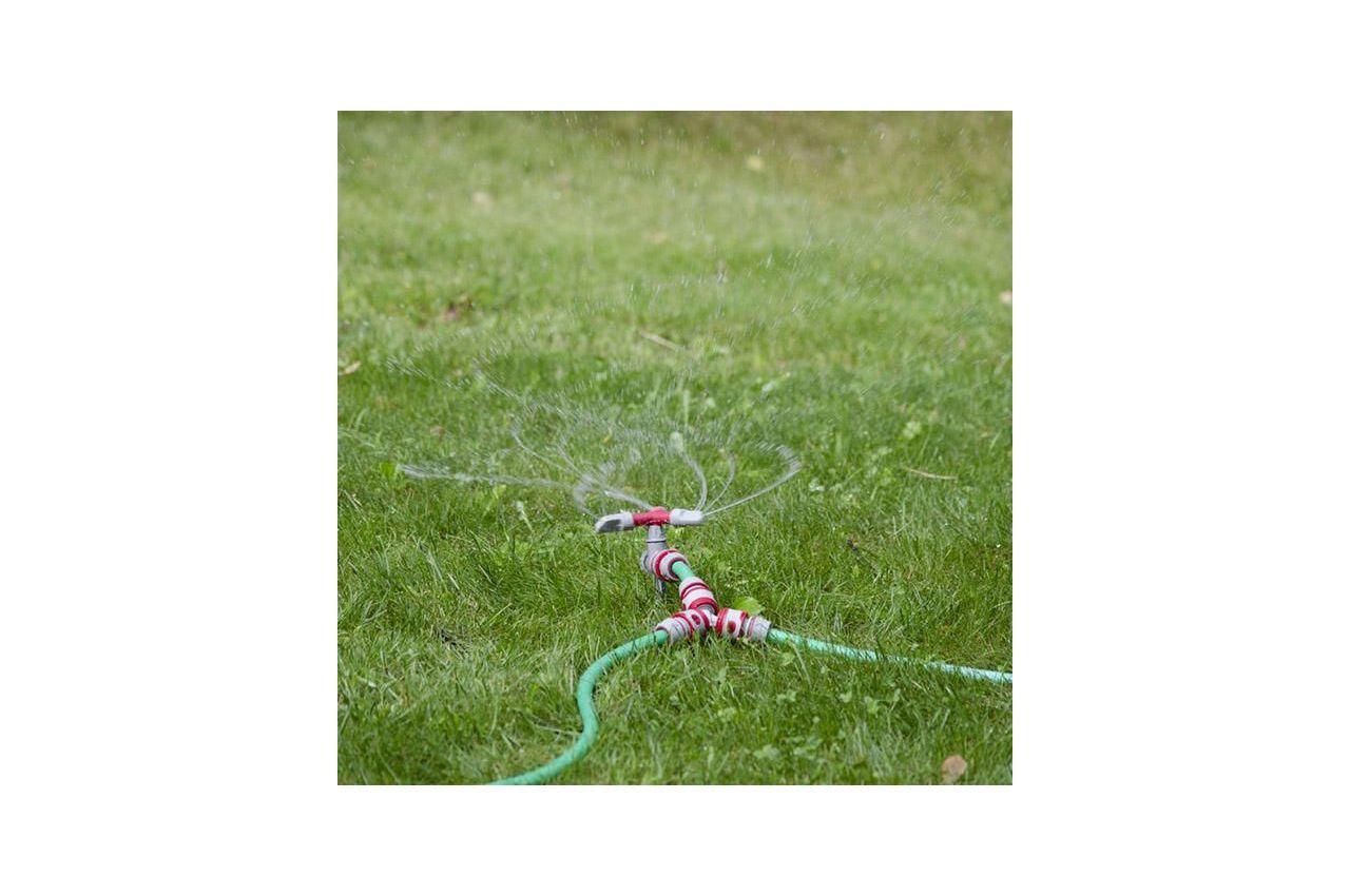 Дождеватель круговой с вращающейся головкой из трех рожков-оросителей, оснащен надежной металлической ножкой-костылем, обеспечивающей фиксацию в любом грунте и быстрое перемещение по участку. При необходимости полива на большой площади, возможно соединение нескольких дождевателей в системе полива. Дальность полива: до 8 м; Диаметр шланга: 1/2"; Другое: костыль из металла