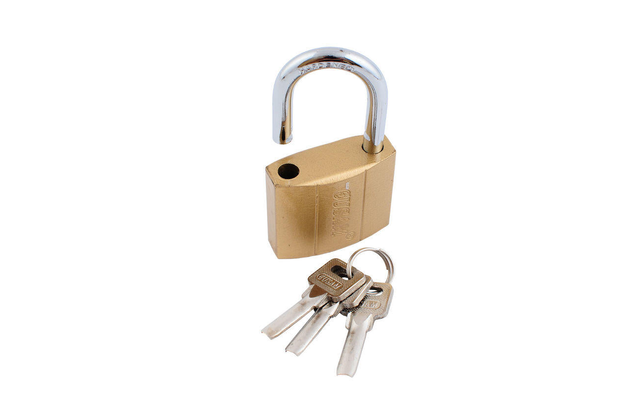 Замок навесной FZB имеет металлическую дужку и литой корпус шириной 75 мм, изготовленный из металла с антикоррозийным покрытием желтого цвета, на корпусе есть декоративное тиснение. В комплекте с замком три лазерных ключа.