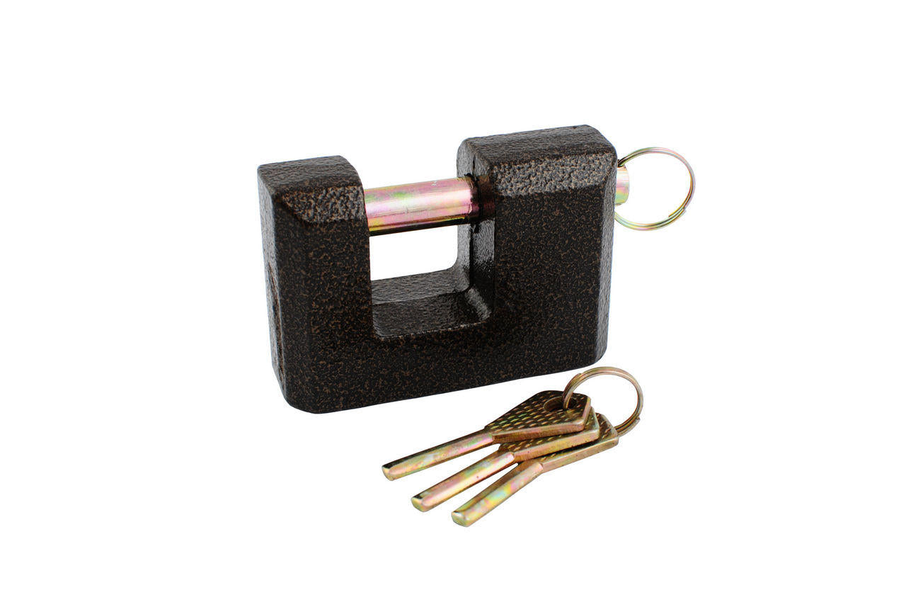 Замок навесной FZB изготовлен из стали покрытый антикоррозийным покрытием, имеет П-образный литой корпус шириной 90 мм. В комплекте с замком три ключа.