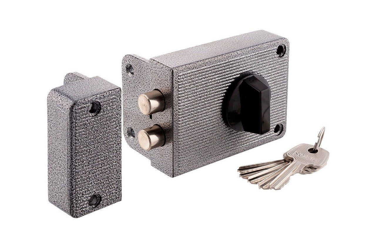 Замок накладной с двумя цилиндрическими штырями засова, имеет надежный механизм. Предназначен для запирания дверей толщиной 35- 45 мм. Модель универсальная и подходит для запирания как правой, так и левой двери.