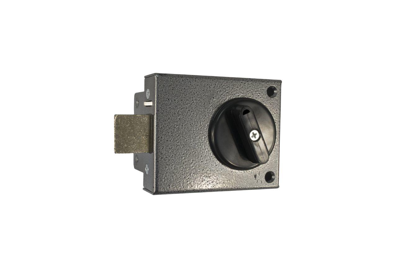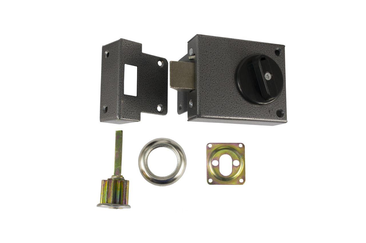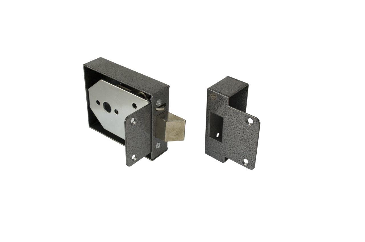 Замок накладной с одним прямоугольным штырем засова. Предназначен для запирания дверей толщиной 35- 45 мм. Модель универсальная и подходит для запирания как правой, так и левой двери.