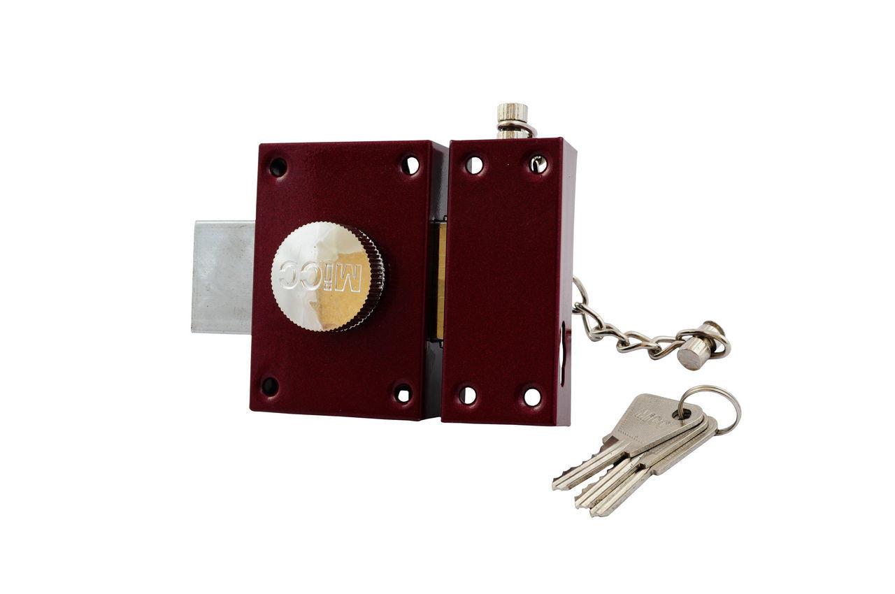 Замок накладной дисковый с одним прямоугольным штырем засова и предохранительной цепочкой. Предназначен для запирания дверей толщиной 35- 45 мм. Модель универсальная и подходит для запирания как правой, так и левой двери.