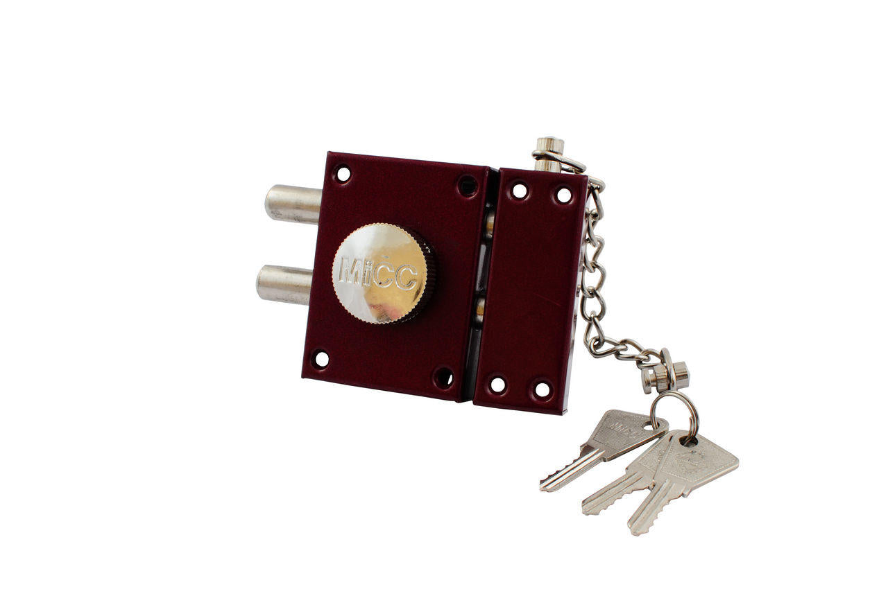 Замок накладной дисковый с двумя штырями засова и предохранительной цепочкой. Предназначен для запирания дверей толщиной 35- 45 мм. Модель универсальная и подходит для запирания как правой, так и левой двери.