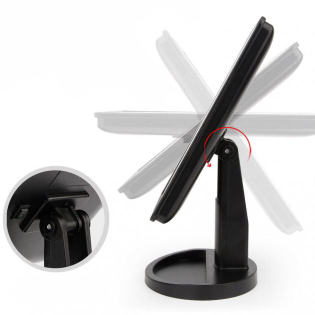 Включить и выключить зеркало можно при помощи специальной сенсорной кнопки. Освещение работает за счет обычных батареек. Специальная подставка позволит разместить на ней различные косметические мелочи, например, губную помаду, пудру, тени для глаз или что-нибудь другое, а свободное вращение на 180° позволяет зафиксировать косметическое зеркало в удобном для вас положении.