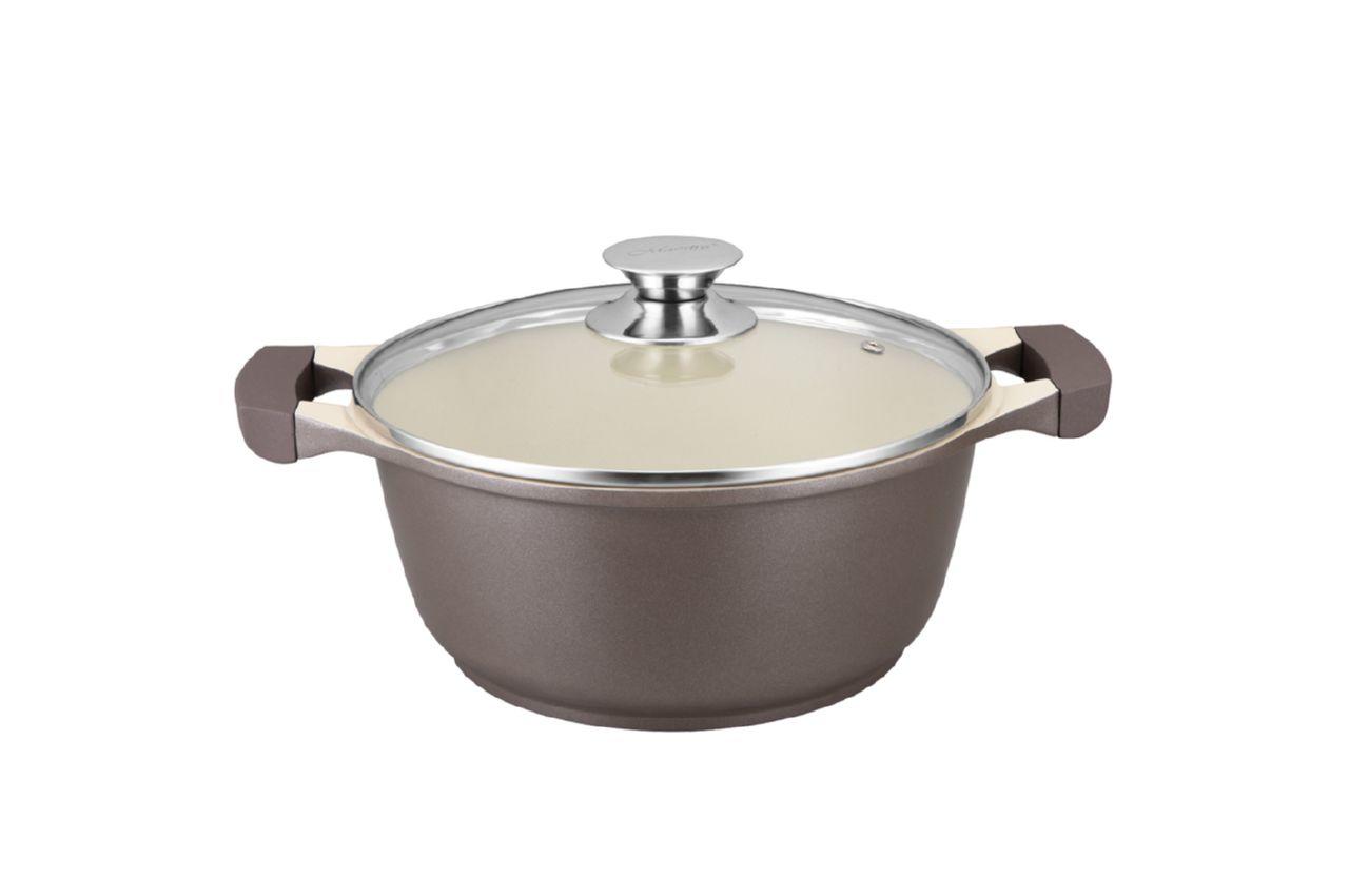 Кастрюля объемом 3,8 литров изготовлена из прочного литого алюминия с внутренним антипригарным керамическим покрытием, обладает удобными ненагревающимися ручками и стеклянной крышкой с отверстием для выхода пара. Подходит для всех источников тепла включая индукцию.