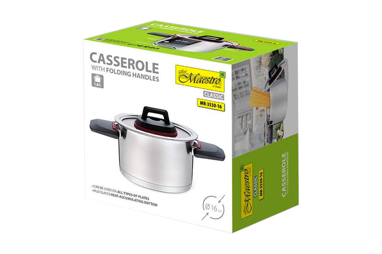 Кастрюля Maestro MR 3530-16 создана для экономии места. Ручки кастрюли складываются и потому она занимает минимум места. Все кастрюли серии 3530 отлично помещаются друг в друга, как детская пирамидка в сложенном виде. А потому все кастрюли занимают только место самой большой. Эта же функция есть у ручек крышек. Они складываются и все крышки можно удобно разместить стопочкой или поставить вертикально.
