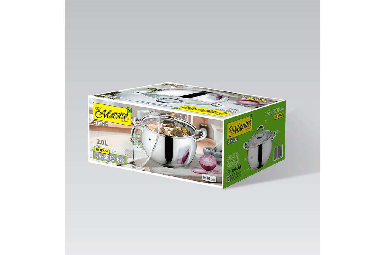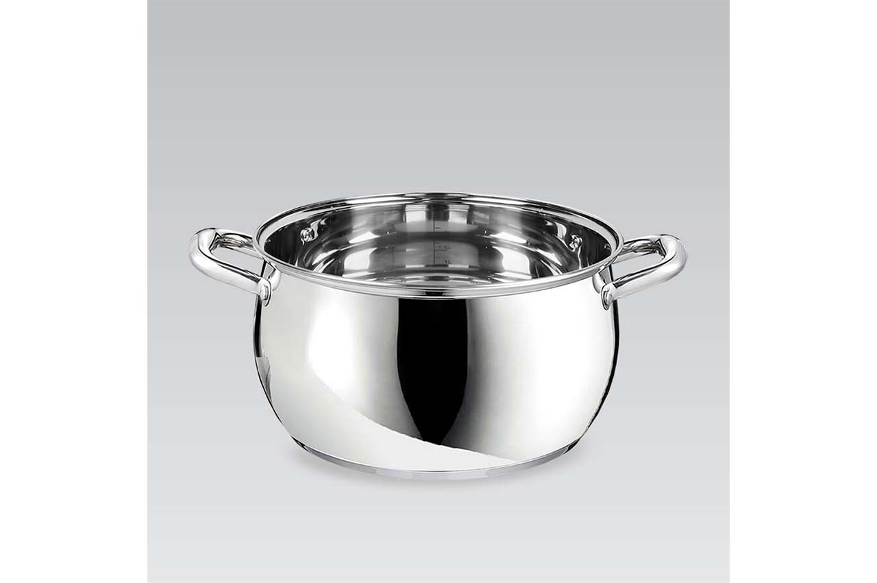 Кастрюля Маестро MR 3515-16. Современный дизайн, блестящая полировка и красивые округлые ручки. Смотрится модно, современно и в то же время уютно. Благодаря округлому дизайну вмещает больше жидкости, чем аналогичные модели с прямыми стенками.