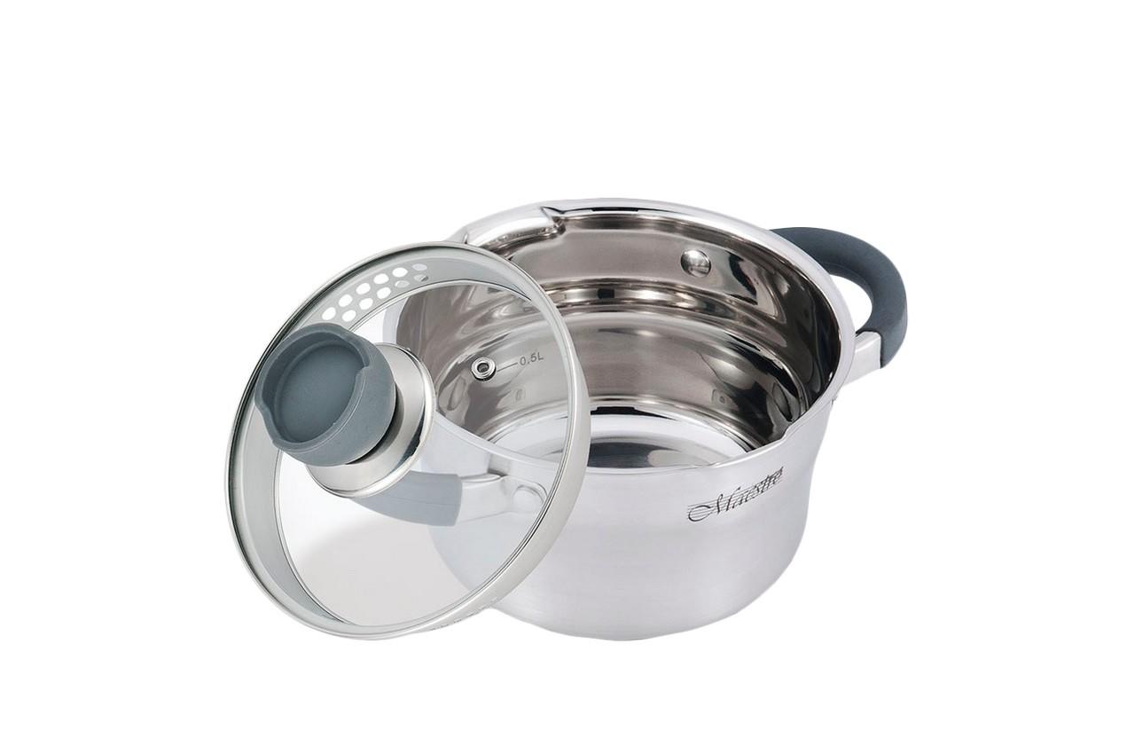 Материал - высококачественная нержавеющая сталь. Удобные металлические ручки. Шкала объема жидкости. Многослойное термоаккумулирующее дно. Подходит для всех типов плит и варочных поверхностей. Крышка из термостойкого стекла с отверстиями для выпуска пара. Можно мыть в посудомоечной машине