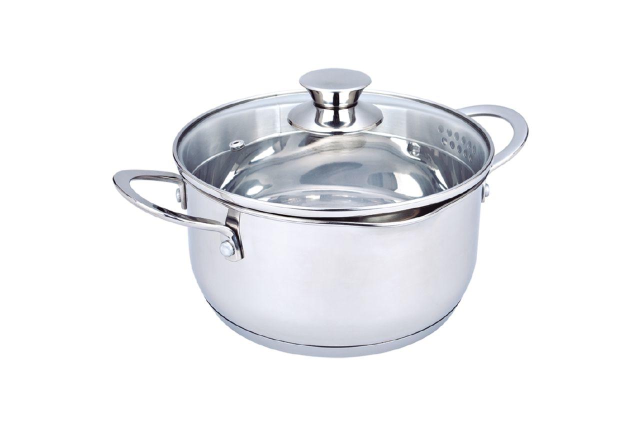 Материал - высококачественная нержавеющая сталь. Удобные металлические ручки. Шкала объема жидкости. Многослойное термоаккумулирующее дно. Подходит для всех типов плит и варочных поверхностей. Крышка из термостойкого стекла с отверстиями для выпуска пара. Можно мыть в посудомоечной машине