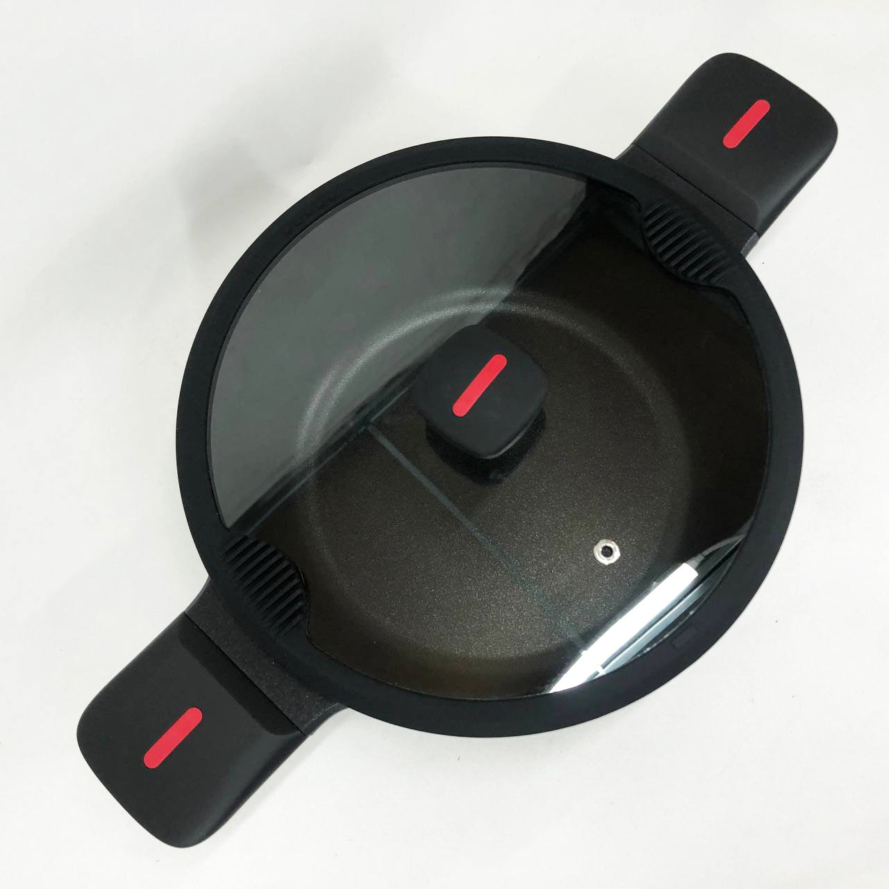 - Крышка: Да, в комплекте, из закаленного стекла, со специальными отверстиями для выхода пара и слива жидкости; с силиконовым кольцом, защищающим от сколов и специальными силиконовыми вставками, защищающими пальцы от ожогов