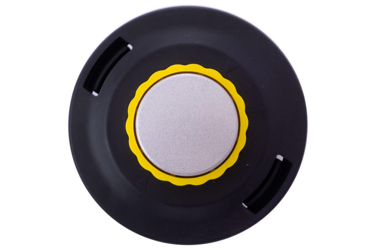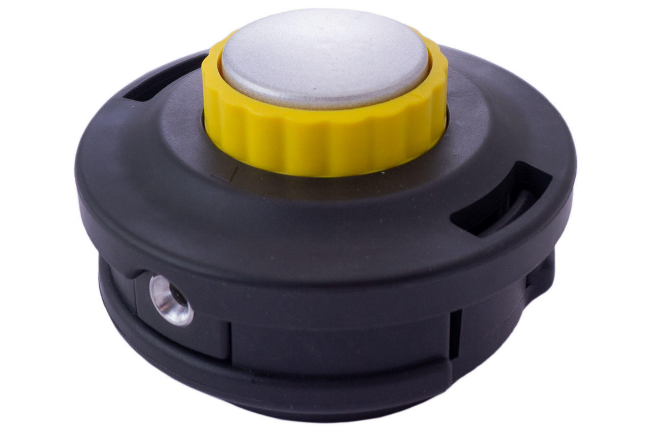 Катушка для триммера автоматическая. Для обновления лески ее не надо разбирать. Достаточно отрезать кусок нужной длины, продеть его через катушку, предварительно совместив отверстие для лески со стрелкой на триммерной головке. Далее совмещают два конца, чтобы выровнять их по длине, а затем наматывают леску, прокручивая головку. Плотность намотки равномерная, за этим следит несложный механизм.