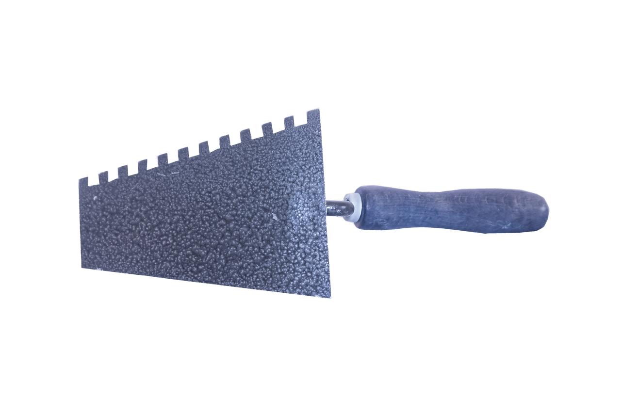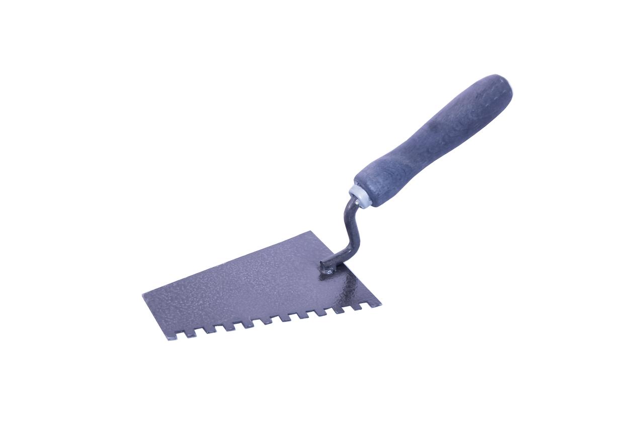 Кельма четырехугольная имеет изогнутую ручку и шлифованную деревянную рукоятку для удобной работы с инструментом. Кельма четырехугольная представлена в виде четырехугольной лопатки с размером рабочего полотна 140х100 мм. Данная четырехугольная кельма имеет зуб 6х6 мм, который расположен с левой стороны кельмы. Кельма четырехугольная широко используется для укладки, разравнивания, перемешивания и наброски клеевого раствора на любые поверхности при проведении облицовочных работ любой сложности.