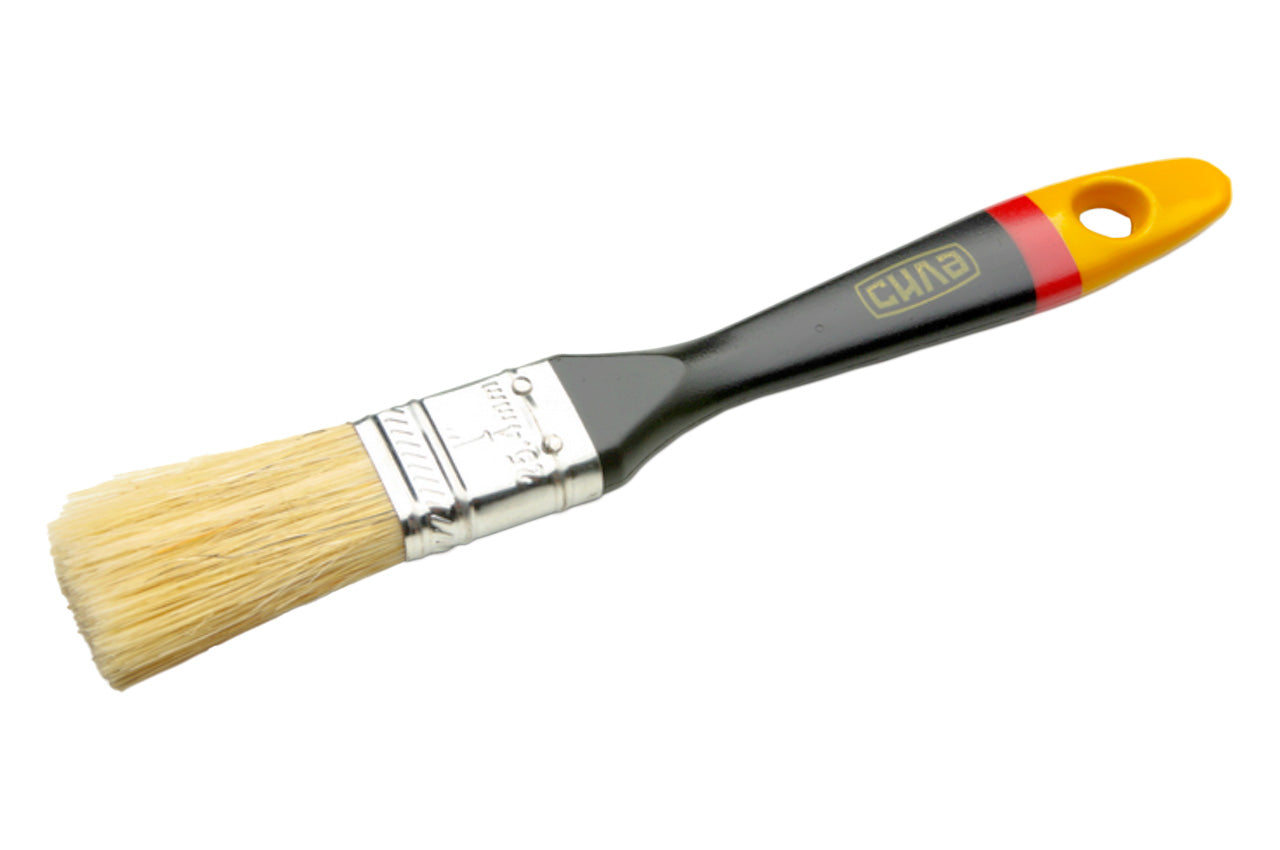 Щетина — смешанная (микс) натуральная + искусственная. Такая щетина подходит для использования с любыми красками и лаками, но при длительном использовании с ЛКМ на агрессивной основе (например, на пару дней оставили кисть в банке с растворителем) кисть теряет свои свойства (выпадает щетина). Смешанная щетина достаточно мягкая и тонкая, поэтому можно добиться идеально тонкого и ровного слоя краски. Крепление щетины - «юбка» изготовлена из качественного нержавеющего метала, закреплена к рукоятке в 4-х местах специальными гвоздями. Рукоятка — изготовлена из пластика, имеет 3-х цветную окраску (черный, желтый, красный) есть отверстие для подвешивания. Длина щетины: 44 мм; Материал рукоятки: деревянная; Материал щетины: натуральный, искусственный; Толщина щетины: 11,5 мм