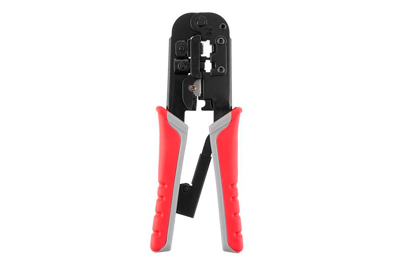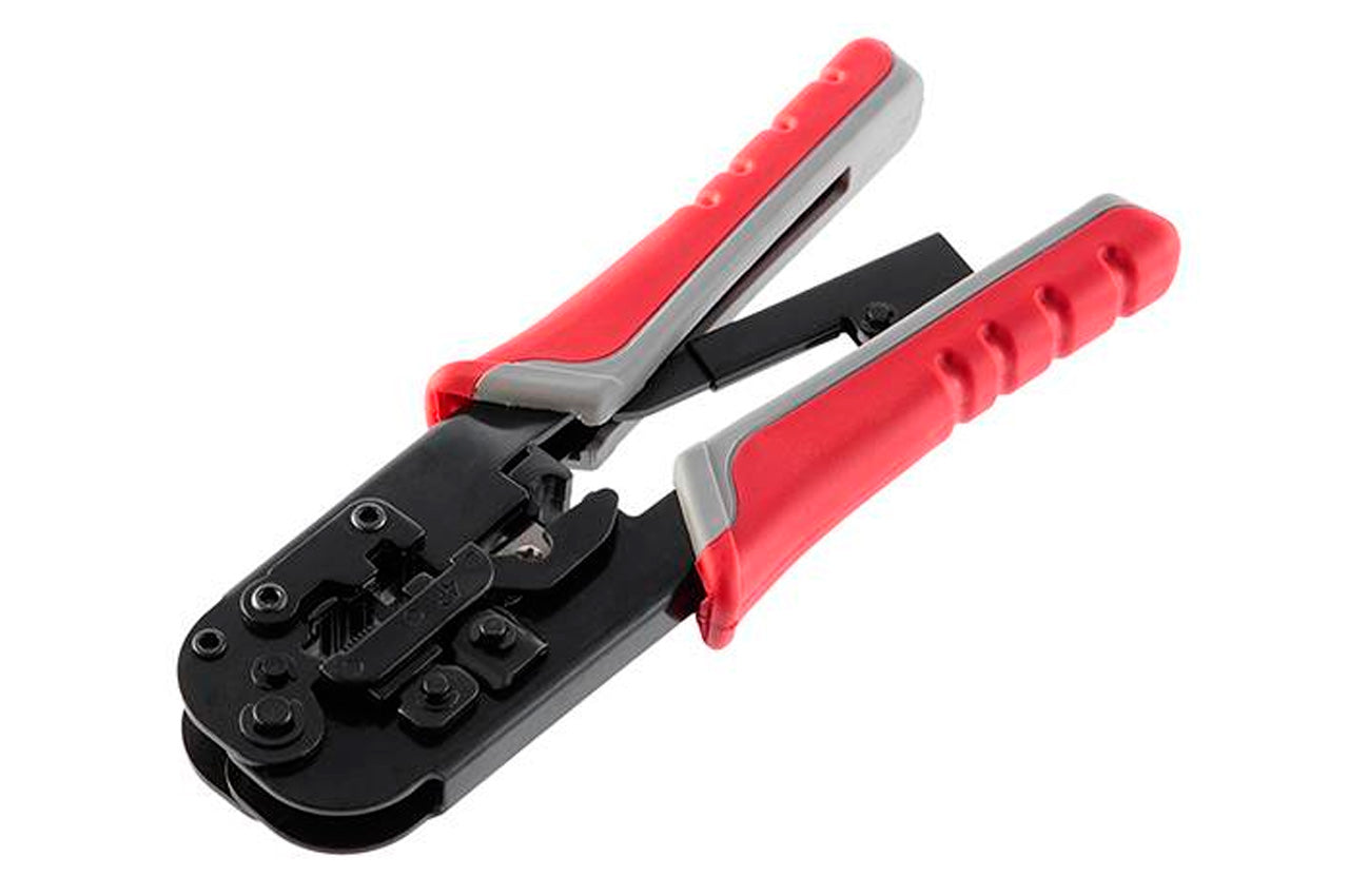 Клещи для опрессовки коннекторов RJ11, RJ12 и RJ45 с ножами для обрезки и очистки кабелей от озоляции. Рукоятки пластиковые касного с серым цвета. Материал рукоятки: пластик