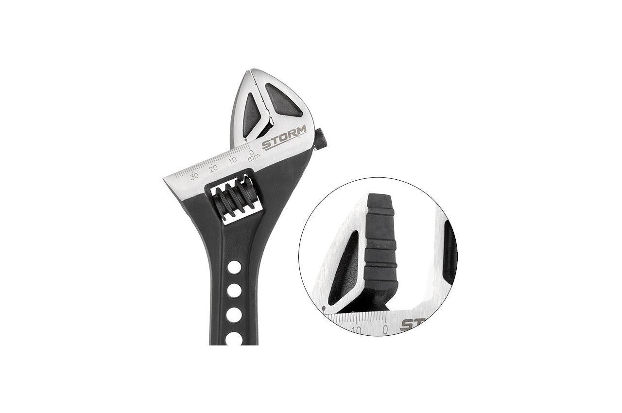 Разводной ключ STORM XT-0085 пригодится в любых слесарно-столярных работах. Благодаря высокому качеству изготовления, применяется в профессиональных сферах, где работы проводятся с постоянными высокими нагрузками. Также станет вашим надежным помощником в быту на долгие годы! Высокое качество изготовления Ключ обладает исключительной стойкостью к высоким нагрузкам - изготовлен из Cr-V стали, методом ковки. В составе стали присутствуют присадки хрома и ванадия, которые придают изделию высокую стойкость к износу. Такой ключ отличается долговечностью и не подвержен хрупкому разрушению. Твердость стали достигает показателя 50HRC. Антикоррозийное покрытие Фосфатное покрытие надежно защищает ключ от появления коррозии. Удобство в работе Угол отклонения головки составляет 22,5ᴼ, что обеспечивает комфортную работу. Выгравированная миллиметровая шкала не стирается со временем и позволяет быстро настроить нужный размер. Ключ компактный и легкий за счет геометрически круглой ручки. Рукоятка из TPR резины обеспечит надежный захват даже промасленными и грязными руками. Защита крепежа Функция защиты гаек на губках сохранит грани крепежа, исключив проскальзывания. Длина ключа: 300 мм; Материал рукоятки: TPR резина; Максимальное расстояние между губками: 38 мм