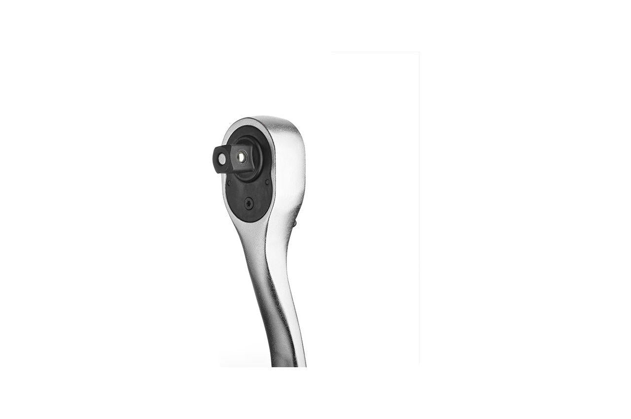 Трещоточная рукоятка – необходимая вещь в арсенале любого хозяина или мастера-профессионала. Предназначена для различных монтажно-слесарных работ, применяется для монтажа и демонтажа резьбовых соединений. Работает в комплексе не только с торцевыми головками, но и с удлинителями, воротками и другими инструментами. Размер присоединительного квадрата – 1/2". Особенности: Выносливая, износостойкая Cr-V сталь Удобная прорезиненная рукоятка Работает в ограниченных пространствах и в труднодоступных местах Трещотка изготовлена из прочной Сr-V стали и выдерживает значительные нагрузки. Два слоя никелевого покрытия уберегут инструмент от коррозии и во множество раз продлят срок службы. Все детали храпового механизма изготовлены в Тайване, отличаются надежностью и плавностью хода. 72 зуба с мелким шагом дают возможность работать в ограниченном пространстве. Трещотка с изогнутой формой ручки достает крепежи в самых труднодоступных местах. Наличие реверса и быстрая смена головок упростят вашу работу во множество раз! Трещотка удобно лежит в руке благодаря двухкомпонентной рукоятке с резиновым антискользящим покрытием. Общая длина: 250 мм; Квадрат: 1/2"