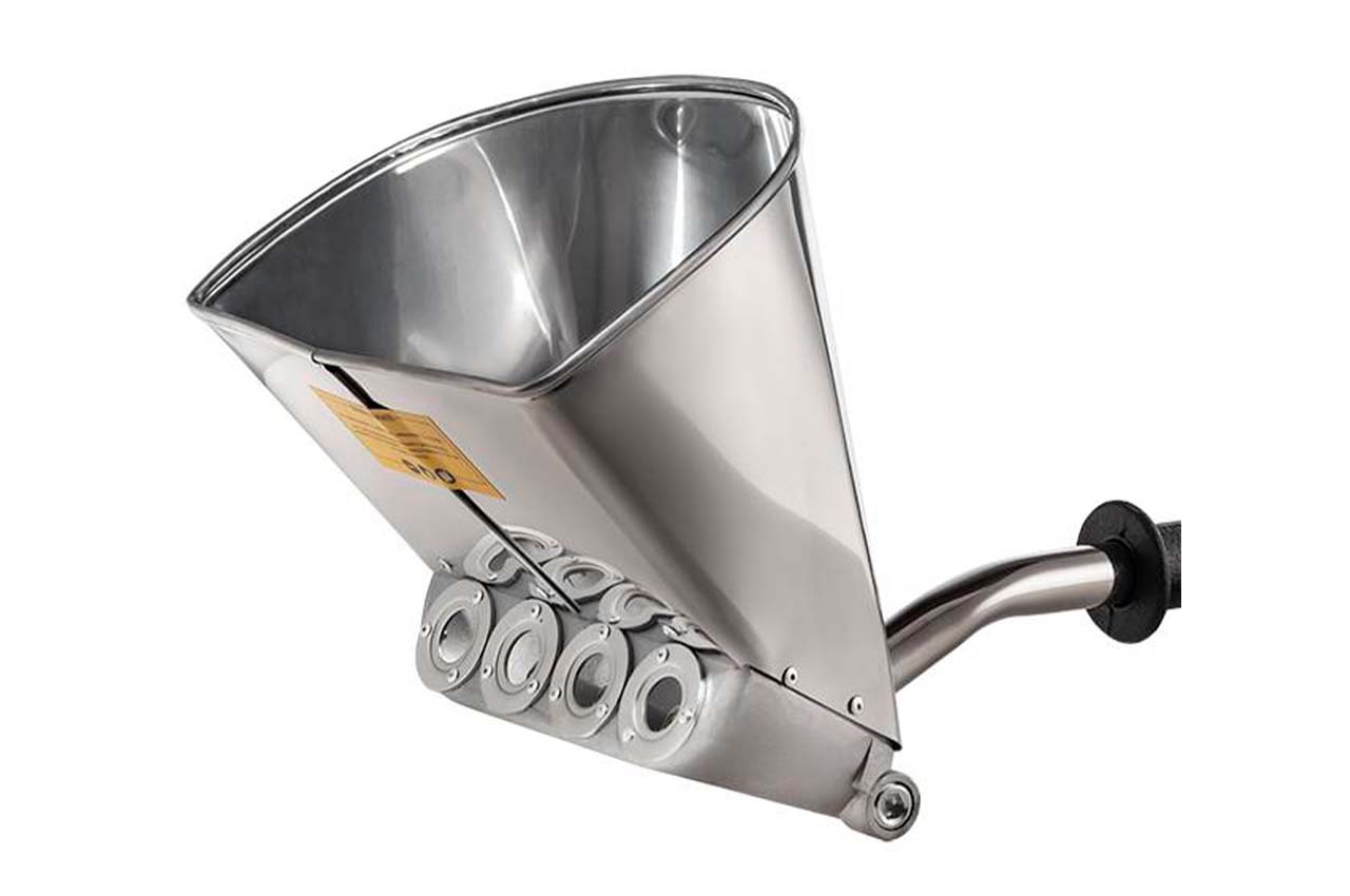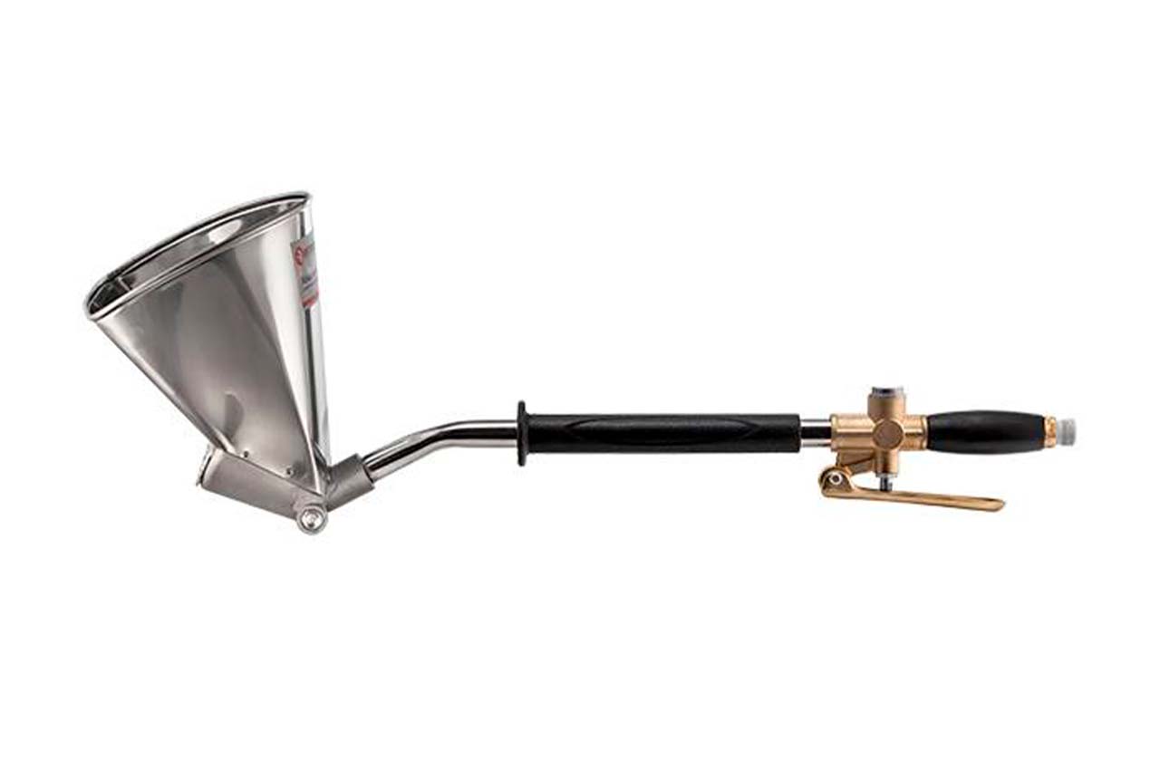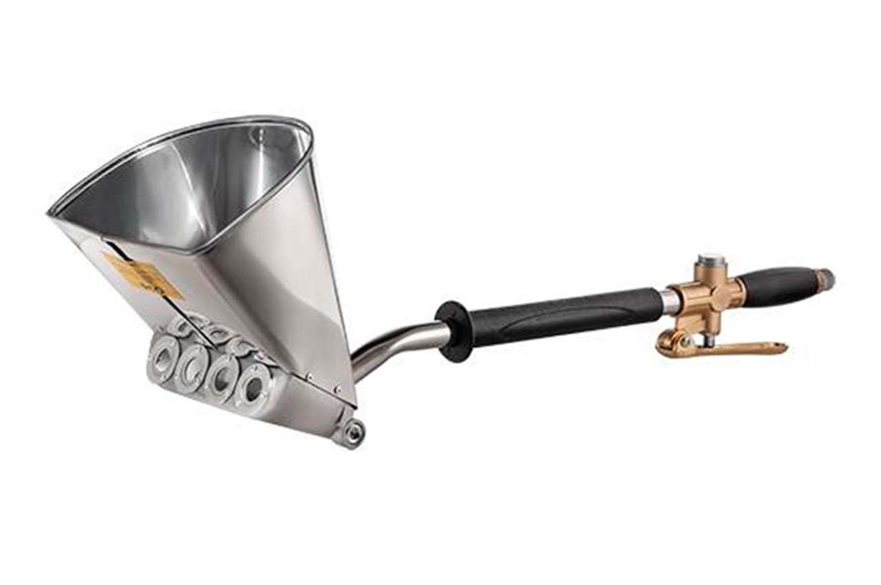 Благодаря четко рассчитанному углу наклона бункера (емкости для раствора) и сопелам, процесс нанесения штукатурных растворов происходит максимально удобно в вертикальном положении, предотвращая выпадение смеси из бункера. Удлиненная ручка хоппера позволяет штукатурить потолки и "постельные" зоны на невысоких участках без применения лестниц и опор.