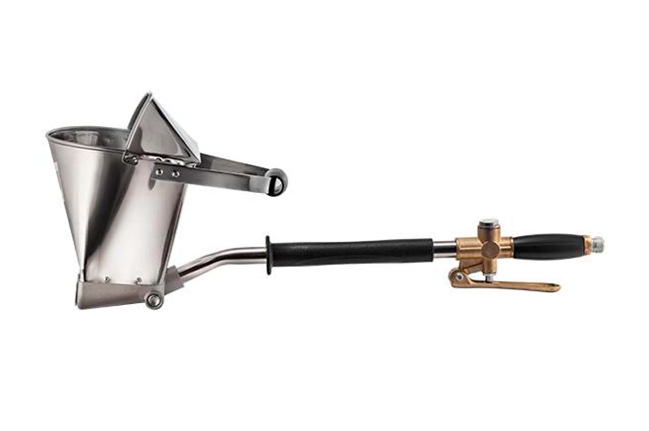 Штукатурный ковш хопер состоит из металлического контейнера 3 л., металлической трубы, рукоятки для удержания ковша, ручки с курком для открытия/закрытия подачи сжатого воздуха, гайки, фиксирующей положение ковша, коннекторов для соединения со шлангом, креплений для установки ручки ковша.