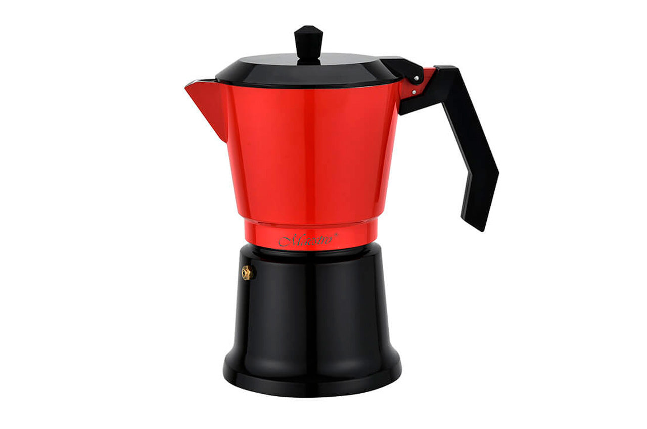 Гейзерная кофеварка Maestro MR 1657-9 черно-красного цвета предназначена для приготовления кофе как эспрессо так и мокко. Кофеварка имеет общий объем (верхний + нижний отсек) 900 мл соответствующий девяти чашкам кофе эспрессо. Выход кофе за одно приготовление 450 мл