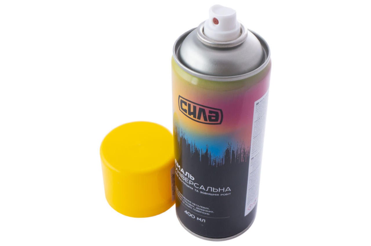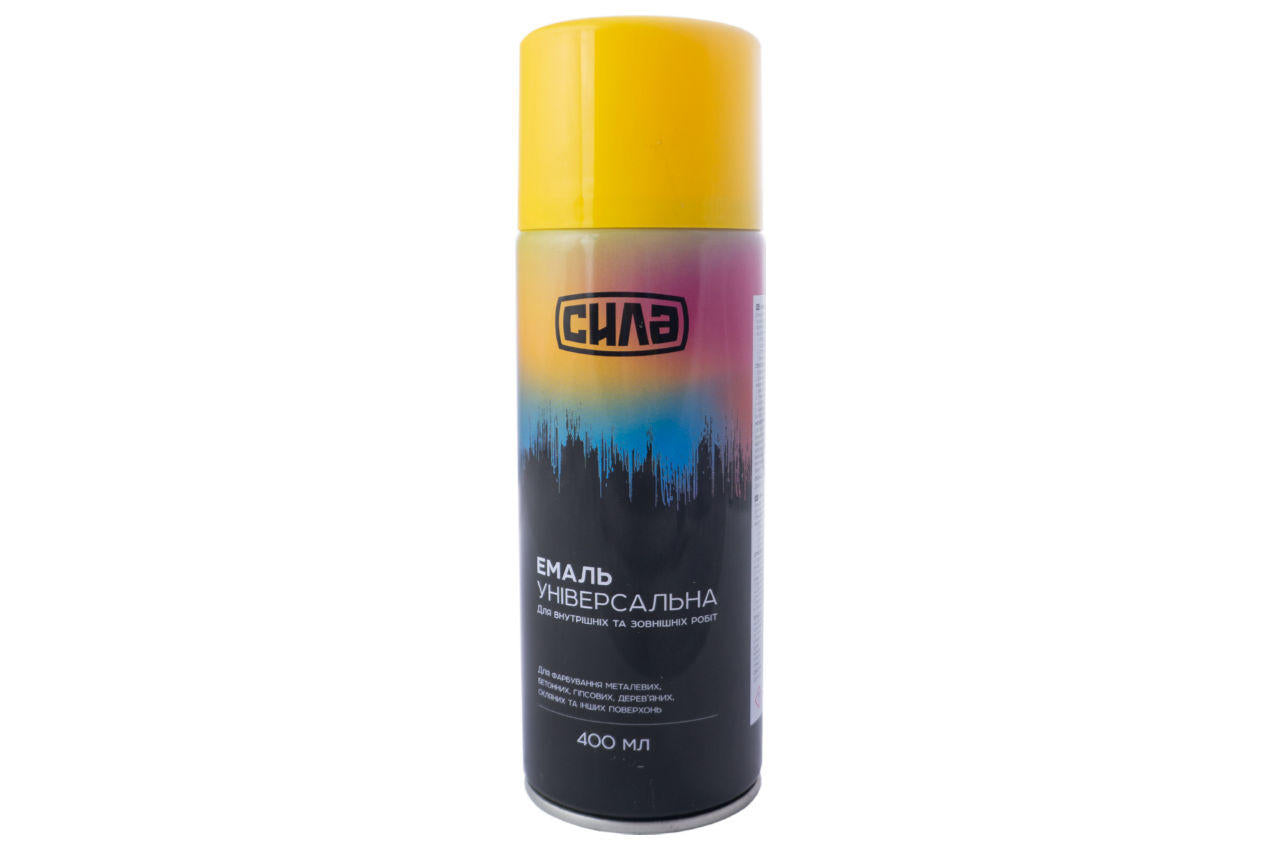 Краска аэрозольная Сила - 400 мл RAL 1023 желтая для покраски металлических, бетонных, гипсовых, деревянных, стеклянных и других поверхностей. Удобна для работы с трафаретами.