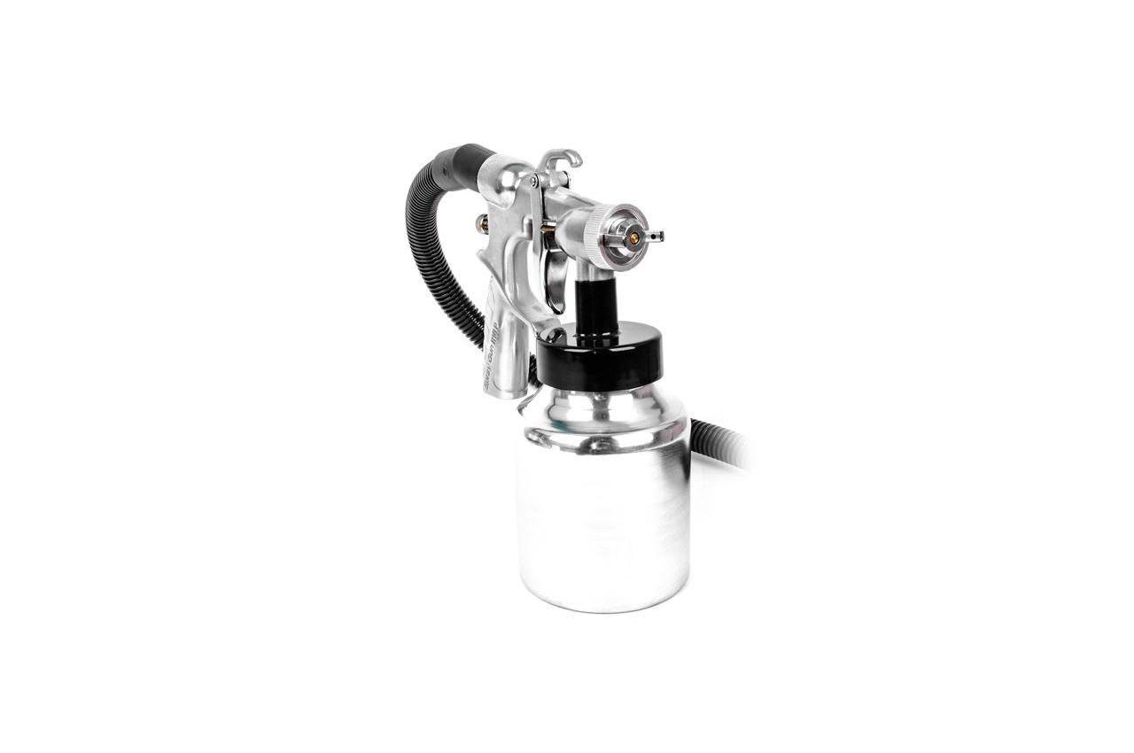 Покрасочный пистолет DT-5060 предназначен для окрашивания различных типов поверхностей. В работе с краскопультом DT-5060 можно использовать: алкидные краски, акриловые дисперсионные лаки, пропитки, жидкости для отпаривания обоев, пестициды, дезинфицирующие средства, холодные очистители, грунтовки для защиты от ржавчины, морилки, модификаторы ржавчины и др. Благодаря системе HVLP осуществляется эффективный перенос лакокрасочного материала на окрашиваемую поверхность с минимизацией потерь. А коллекторный двигатель с турбиной создаст необходимое давление для покраски. Напряжение питания: 230 В; Потребляемая мощность: 600 Вт; Рабочее давление: 0.14-0.70 бар; Расход воздуха: 1650 л/мин; Диаметр форсунки: 1.8 мм; Объем бачка: 1000 мл; Длина шланга: 1.5 м