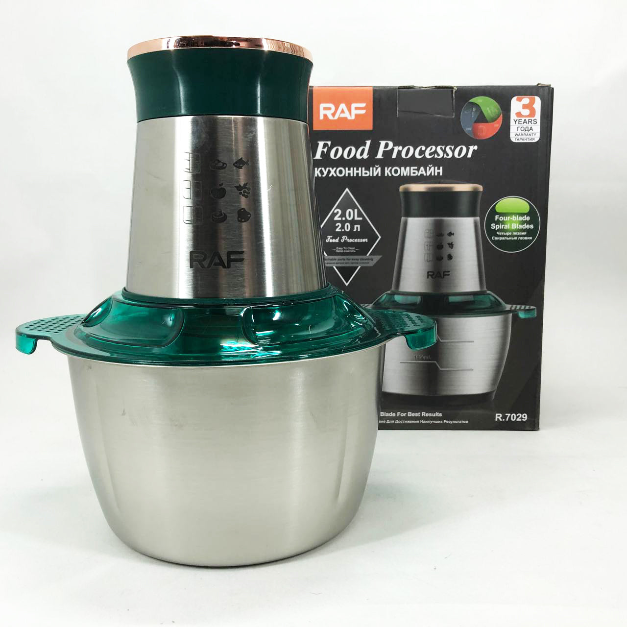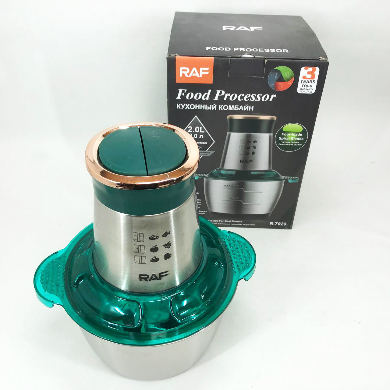 Кухонный комбайн RAF R 7029 - это мощный многофункциональный измельчитель, блендер, мясорубка, мельница для быстрого измельчения как мягких продуктов, таких как: фрукты, перец, смешивание различных соусов, яиц, так и твердых продуктов. мясо, овощи, зерна кукурузы, бобовые, корни растений, кофе, бобы, рис, с возможностью применения не только в домашних условиях, но и для ресторанов и баров.