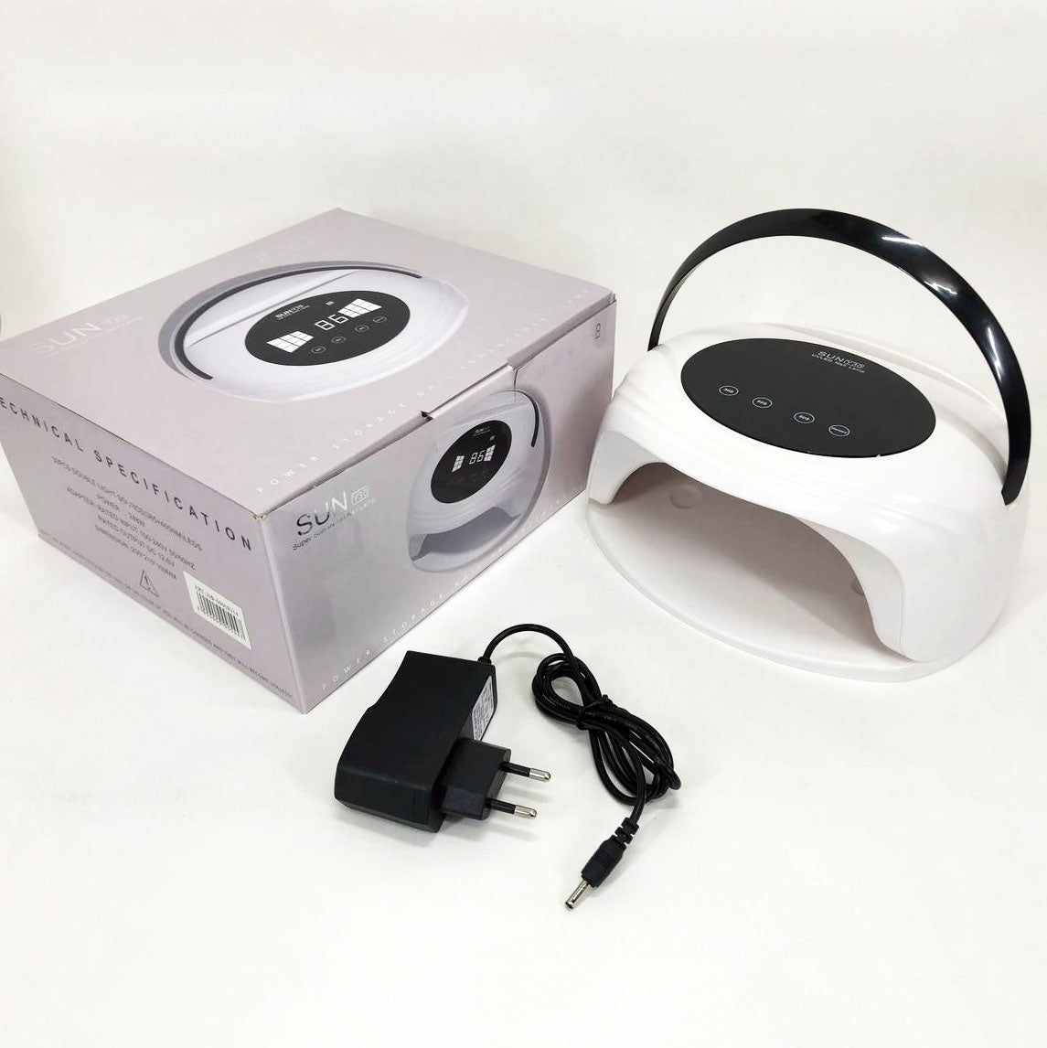 Портативная лампа SUN Y30 на 54 Вт для сушки гель-лака, геля на аккумуляторе имеет пластиковый корпус и 30 светодиодных глистерных ламп. Дно легко снимается. Кнопки таймеров сенсорны и есть электронное табло. Также на лампе есть ручка и отверстие, чтобы ставить туда мобильный телефон. Может работать и от сети. Заряжать аккумулятор нужно около 4 часов.