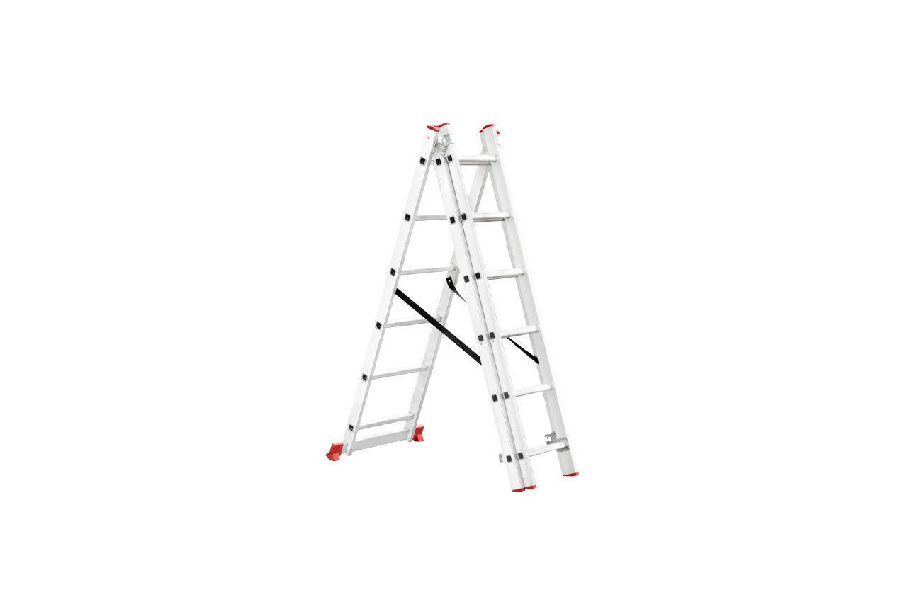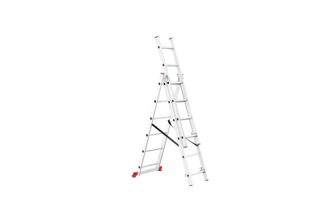 Универсальная алюминиевая 3-х секционная раскладная лестница изготовлена из высококачественного экструдированного алюминиевого профиля. При весе 9,3 кг выдерживает нагрузку до 150 кг. Каждая из 3-х секций оснащена 6 рифлеными ступенями шириной 280 мм. Высота в разложенном виде 3407 мм, в сложенном - 1726 мм. Противоскользящие опорные заглушки обеспечивают надежное сцепление с опорной поверхностью, препятствуют скольжению. Может применяться как приставная, выдвижная лестница и свободностоящая стремянка. Атмосферостойкие ленты предотвращают самопроизвольное раздвижение боковин. Высота в сложенном виде: 1726 мм; Ширина лестницы: 656 мм; Количество ступеней: 6 ед.; Ширина ступени: 280 мм; Максимальная нагрузка: 150 кг