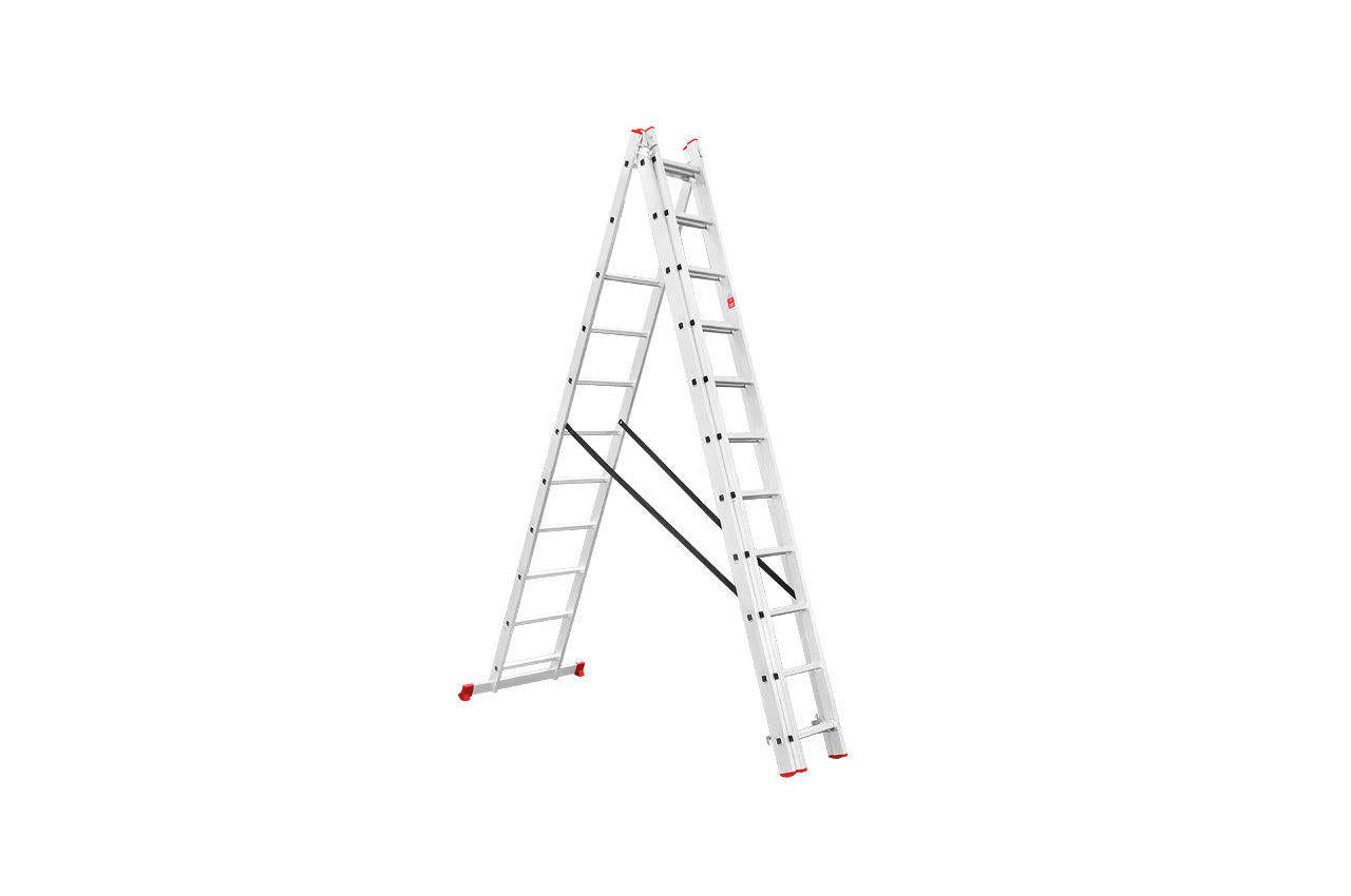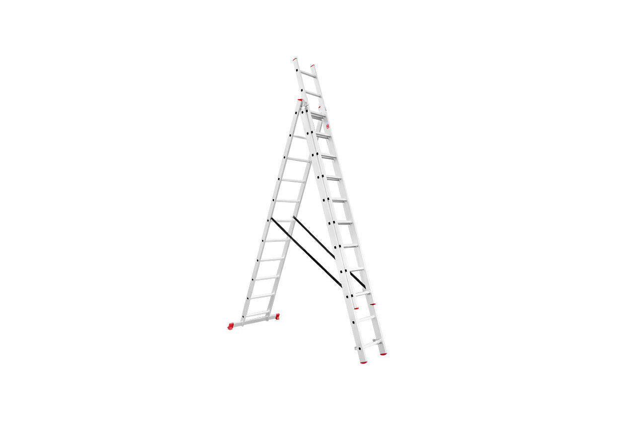 Универсальная алюминиевая 3-х секционная раскладная лестница изготовлена из высококачественного экструдированного алюминиевого профиля. При весе 16,9 кг выдерживает нагрузку до 150 кг. Каждая из 3-х секций оснащена 11 рифлеными ступенями шириной 280 мм. Высота в разложенном виде 7327 мм, в сложенном 3141 мм. Противоскользящие опорные заглушки обеспечивают надежное сцепление с опорной поверхностью, препятствуют скольжению. Может применяться как приставная, выдвижная лестница и свободностоящая стремянка. Атмосферостойкие ленты предотвращают самопроизвольное раздвижение боковин. Высота в сложенном виде: 3141 мм; Ширина лестницы: 886 мм; Количество ступеней: 11 ед.; Ширина ступени: 280 мм; Максимальная нагрузка: 150 кг
