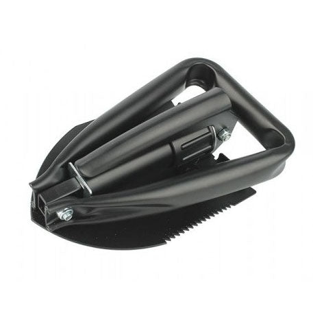 Компактная складная лопата со стальным лезвием и металлической ручкой. С одной стороны имеет зазубренные края, поэтому может использоваться как мотыга.