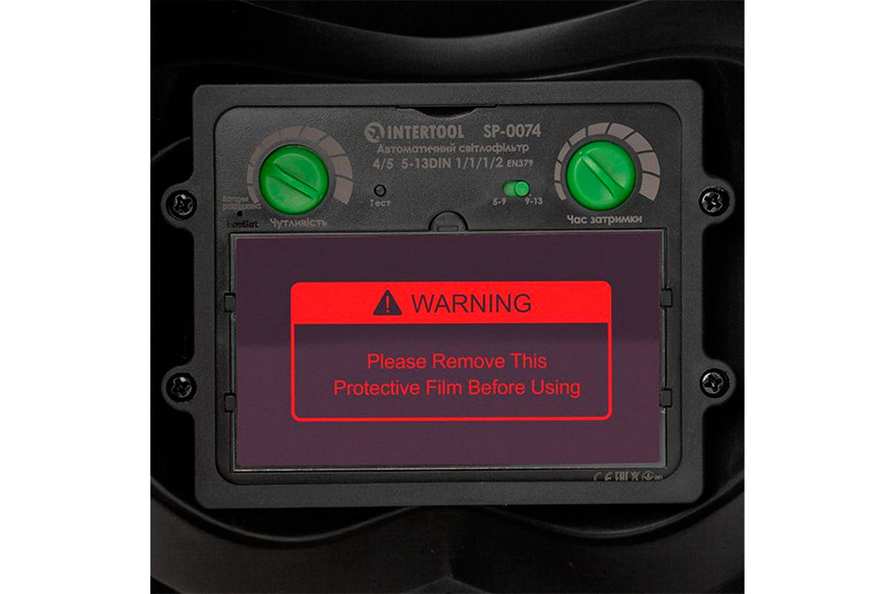 Маска сварщика "Хамелеон". Материал изготовления полипропилен. Плавная регулировка чувствительности. Плавная регулировка задержки. Плавная регулировка затемнения. Степень затемнения - темное состояние: DIN9 - DIN13; Скорость переключения светофильтра: 1/25000 сек; Размер светофильтра: 110х90х9 мм; Температура хранения: от -20 до +70 °С; Степень затемнения - светлое состояние: DIN4 - DIN5; Защита от ультрафиолетовых и инфракрасных лучей (УФ/ИК): DIN16; Размер смотрового окна: 98х53 мм; Оптический класс светофильтра: 1/1/1/2; Емкость аккумулятора: 210 мАч; Аккумулятор: Li-Ion; Рабочая температура: от -5 до +55 °С; Другое: Плавная регулировка чувствительности;Плавная регулировка задержки;Плавная регулировка затемнения;Режим диагностики;Сигнал низкого заряда батареи;Режим шлифования;; Количество сенсоров: 4