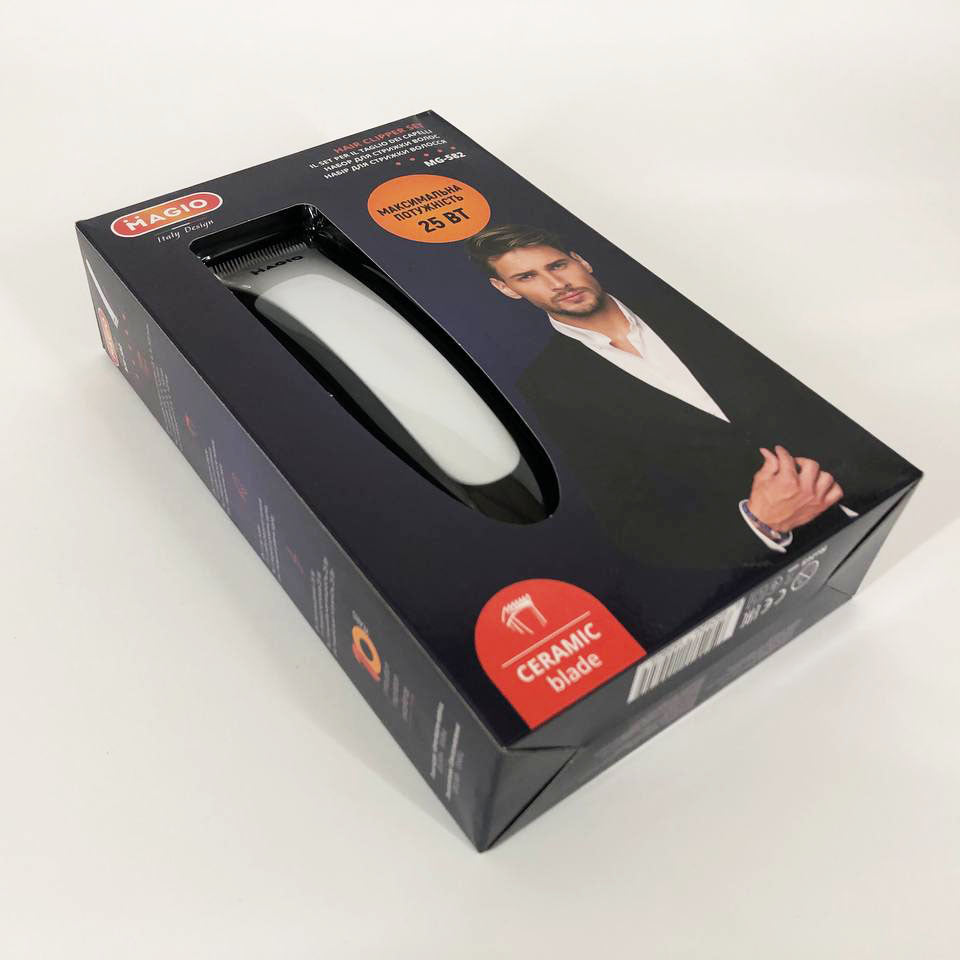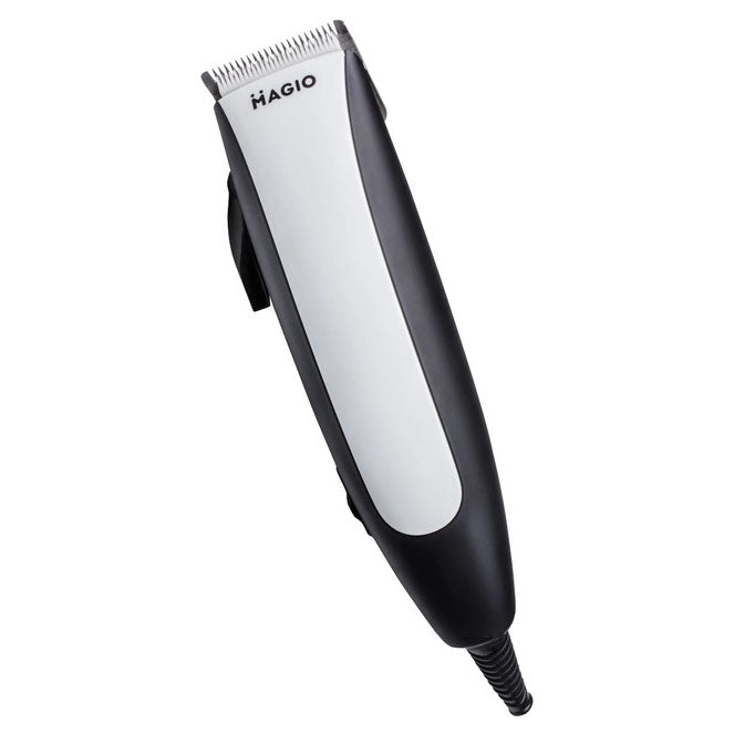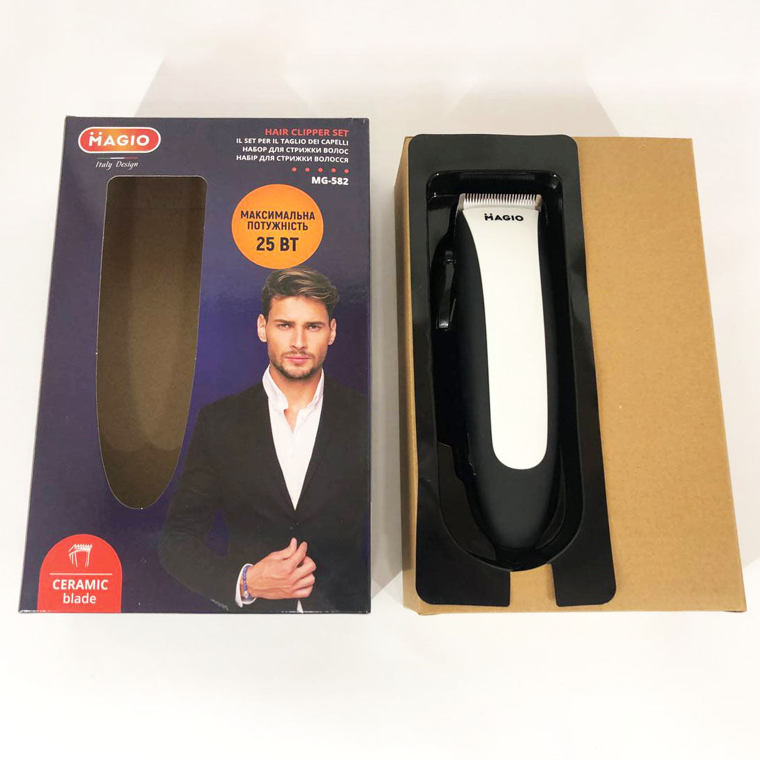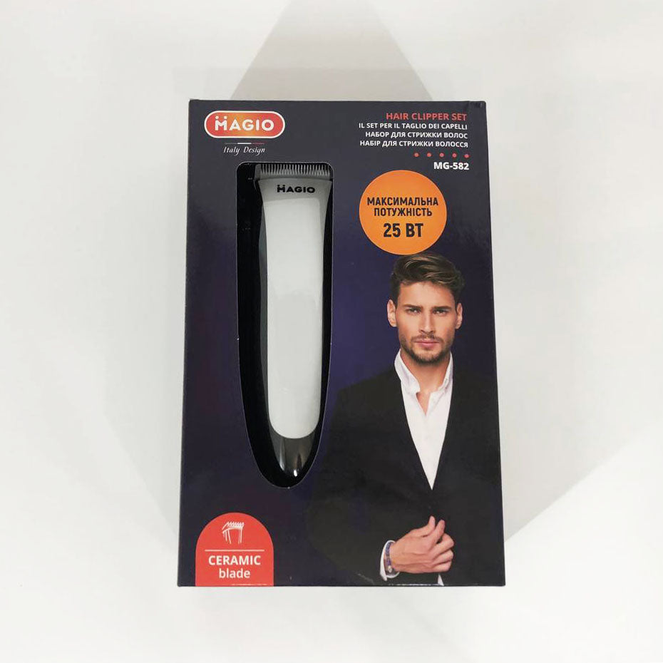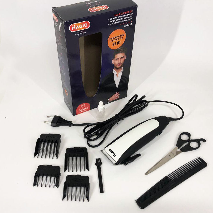 Машинка для стрижки волос Magio MG-582 позволяет не только экономить свое время, избегая очередей и предыдущих записей к парикмахеру, но и никогда не корректировать свою стрижку. Такой аксессуар будет просто незаменим для тех людей, стремящихся выглядеть безупречно. Она выполнена в стильном дизайне и проста в использовании. Низко шумная машинка для стрижки имеет два лезвия: верхнее – из керамики, нижнее – из нержавеющей стали. Эргономичный черенок машинки хорошо ложится в руке, что позволяет комфортно работать. Закругленные лезвия и гребни плавно скользят по коже, не царапая ее, чтобы каждая стрижка была безопасной и приятной. Лезвия после использования можно чистить с помощью щеточки или промыть водой. В наборе к этой модели вы найдете 4 гребня, позволяющие регулировать длину волос от 3 до 12 мм. Удлиненный шнур длиной 2,4 м создает дополнительное удобство при использовании. Благодаря легкости и компактности эта семейная машинка для стрижки волос очень удобна в использовании и подходит взрослым и детям. В комплект также входят расческа, ножницы и масло.