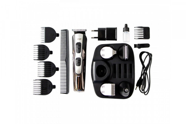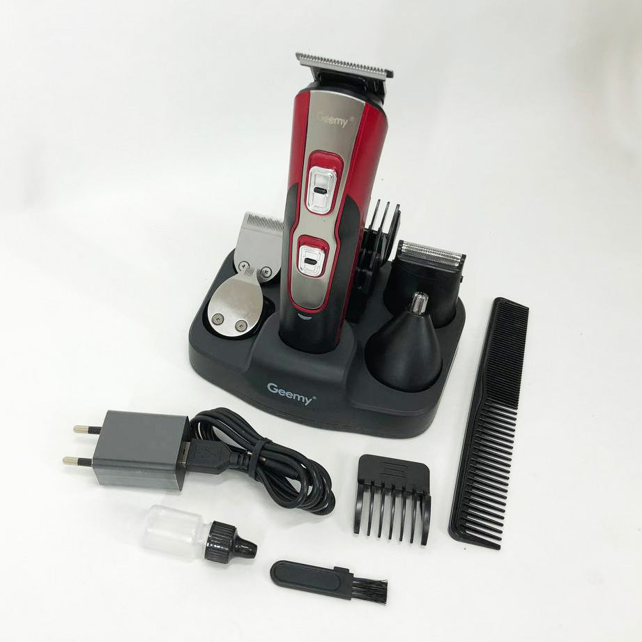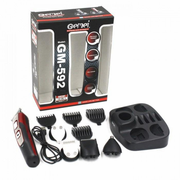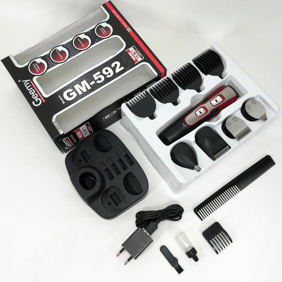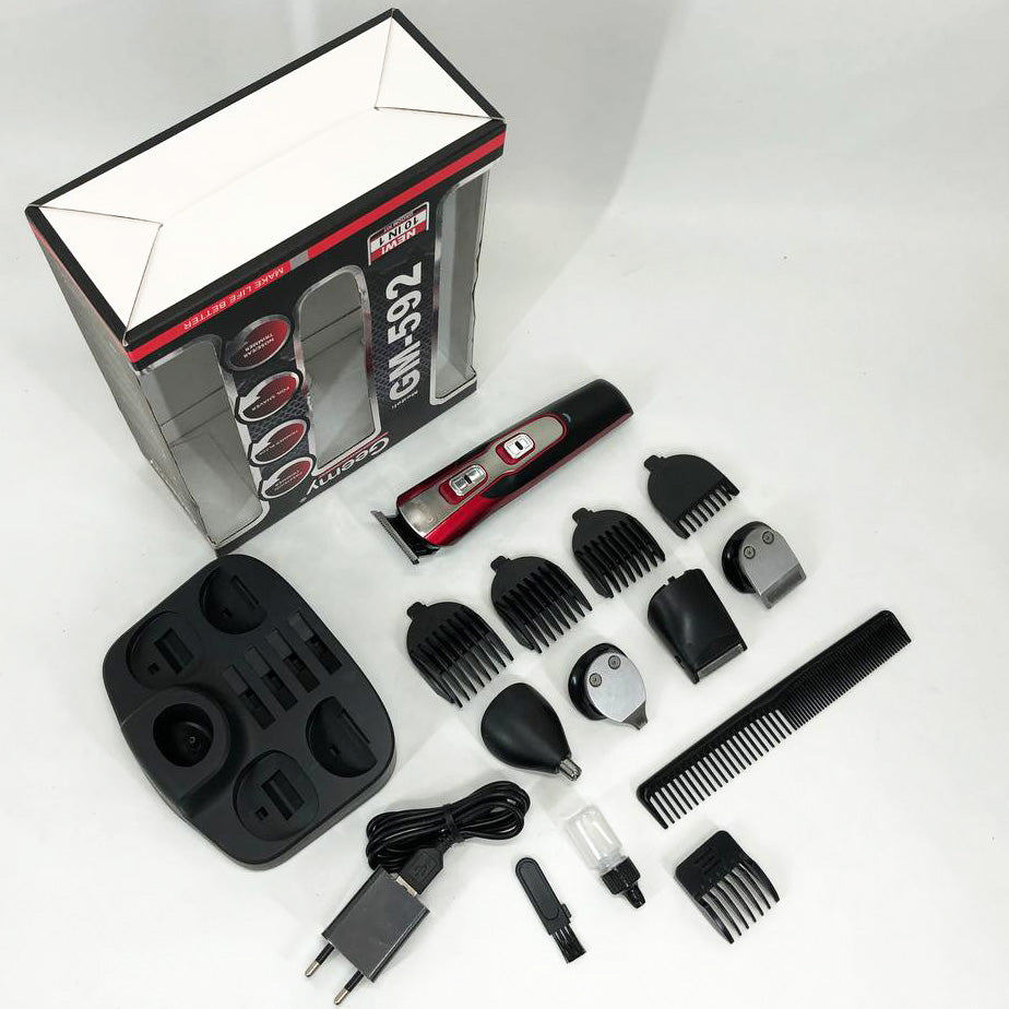 GEMEI GM-592 9 в 1 отличный подарок для современного мужчины, который следит за своей внешностью и любит во всем аккуратность и организованность. На цельной подставке грамотно расположена сама машинка GEMEI GM-592 и сопутствующие ей аксессуары. Каждая из имеющихся с десяти насадок в наборе имеет свое строгое назначение, благодаря этому комплекту мужчина может поддерживать в идеальном состоянии свои усы и бороду, регулировать длину состригаемых волос, а также деликатно избавляться от лишних волос в носу и ушах.
